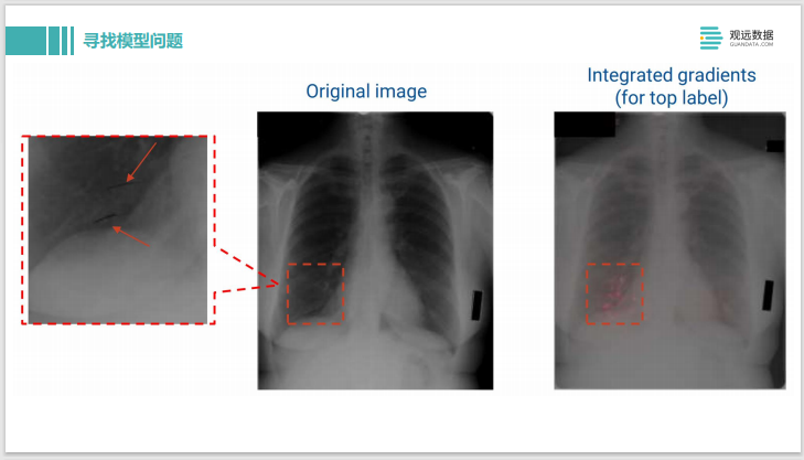 我们可以再把像素点放大,看看模型到底是做了什么样的判断。结果发现这个其实是上面有两条用黑色记号笔画的线,应该是医生在诊断过程中看了X光片,确诊出来有问题,就在这边画了两条马克笔的线,那模型学到的是医生的标记,并不是学到了病理组织的 pattern,所以模型的判断其实是有问题的。这样就可以很方便的通过模型解释的方法去找到模型中的一些弱点。