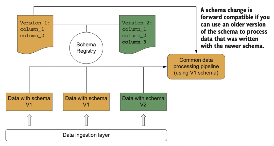当我们说某schema变更「向前兼容」时,它指的是,data transformation pipelines用老版本的schema可以正常读取新数据(用新版本的schema写入的数据)。