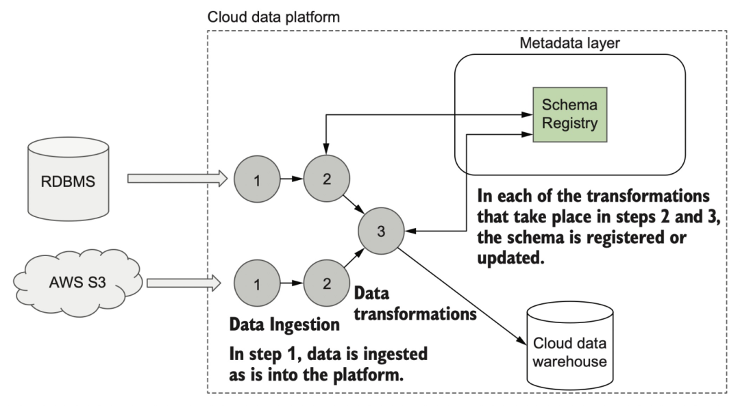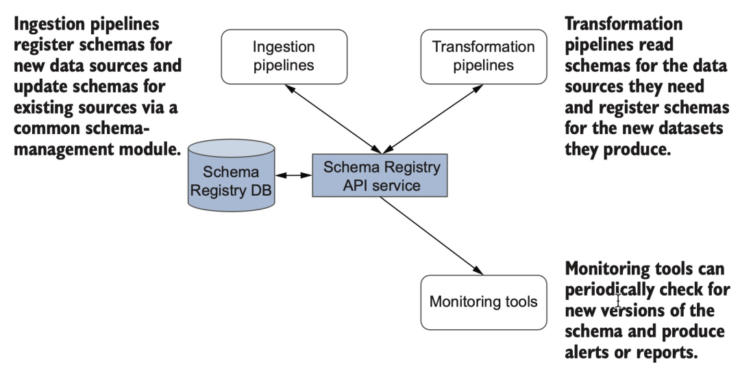 而下游的transformation pipelines(如ETL)在构建过程中首先需要读取schema信息,其次,它最终的输出也是一个新的数据源,自然也会往Registry中增加数据