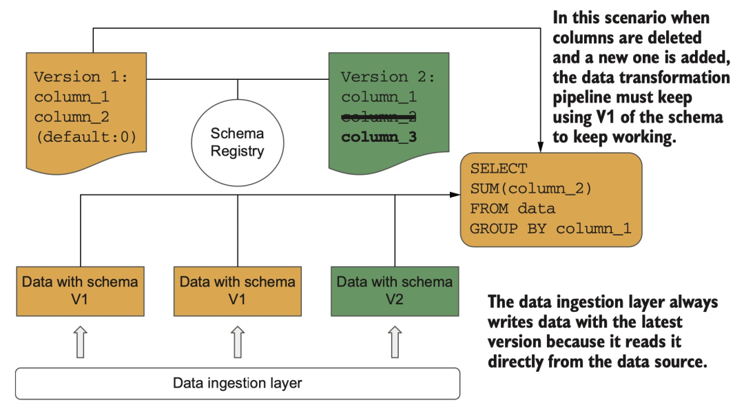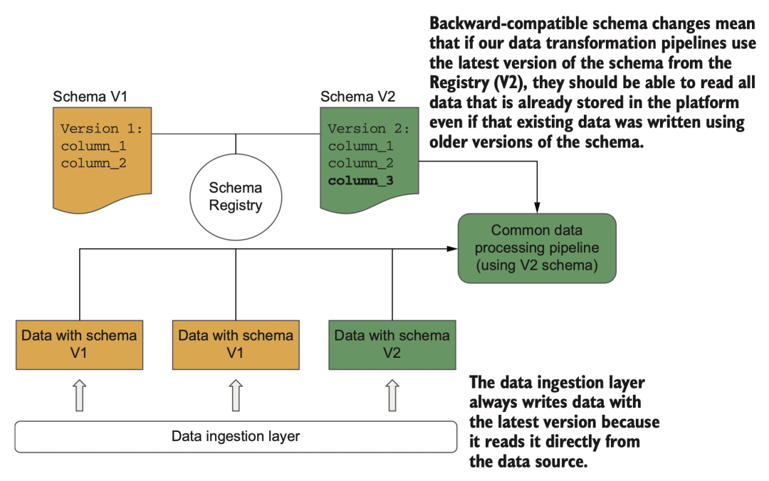 当我们说某schema变更「向后兼容」时,它指的是,data transformation pipelines(不管是Common还是Custom)用最新版本的schema可以正常读取老数据(用老版本的schema写入的数据)。