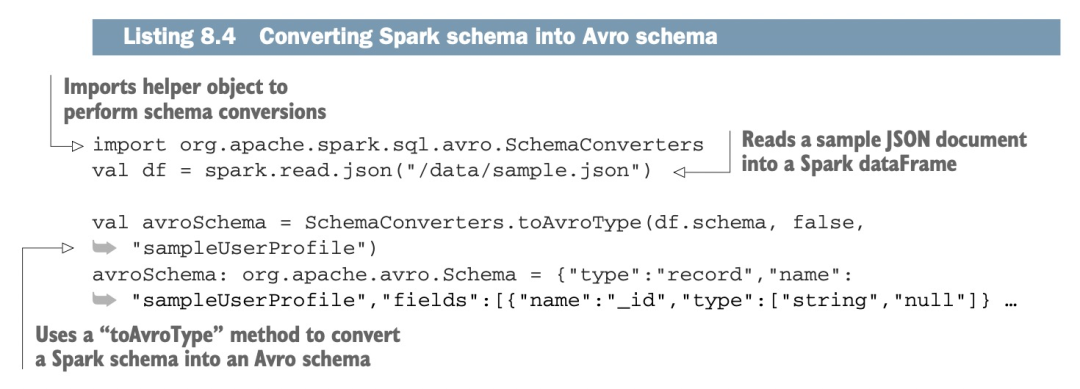 值得注意的是,以上spark的推测结果,其实使用的是spark内部自带的类型系统,我们当然可以把这当成最终结果,但考虑到我们设计的是一个能广泛兼容的数据平台,所以我们会考虑将spark推测出来的schema信息转换成Avro Schema再存入我们的Registry当中。