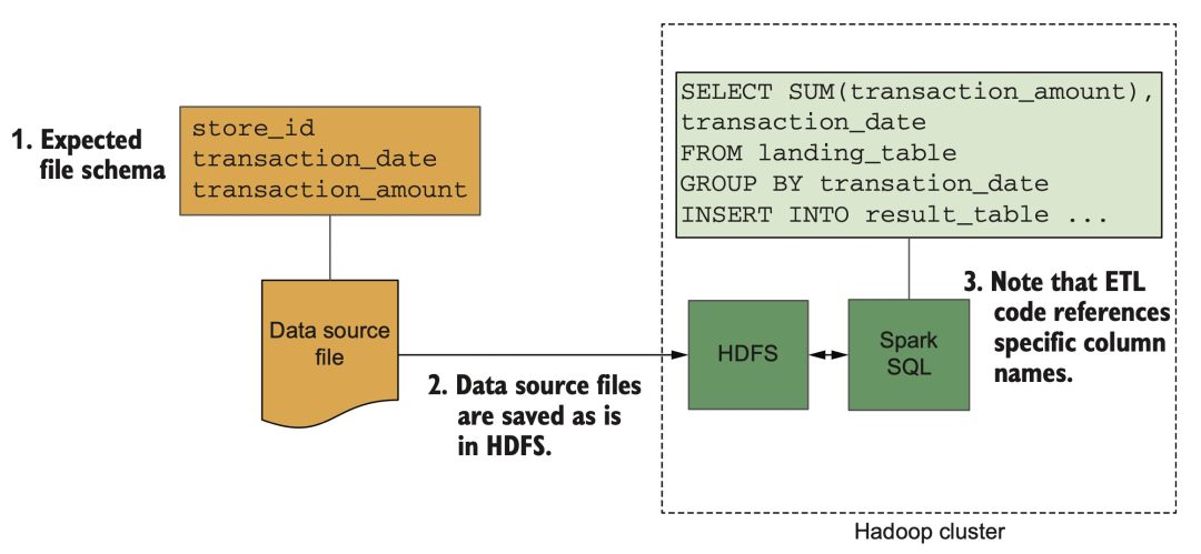 这次,我们把下游的ETL逻辑也加进来。ETL pipeline在运行时本质上是生成一段sql(本书所描述的clould data platform底层基于spark,所以生成的是sparkSQL),sql会引用具体的字段名称。