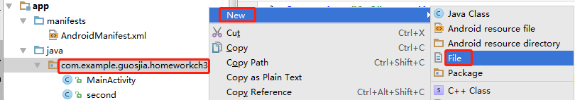 创建名称为homeworkch3_1的新项目。在本项目中要建立两个页面文件及两个控制文件,第一个页面的界面布局文件为activity_main.xml、控制文件为MainActicity.java,第二个页面的界面布局文件为second.xml、控制文件为secondActivity.java,还要修改配置文件AndroidMainifest.xml。