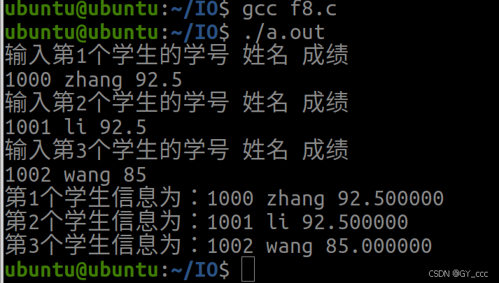 printf("第%d个学生信息为:%d %s %f \n", i+1, s[i].id, s[i].name, s[i].score);