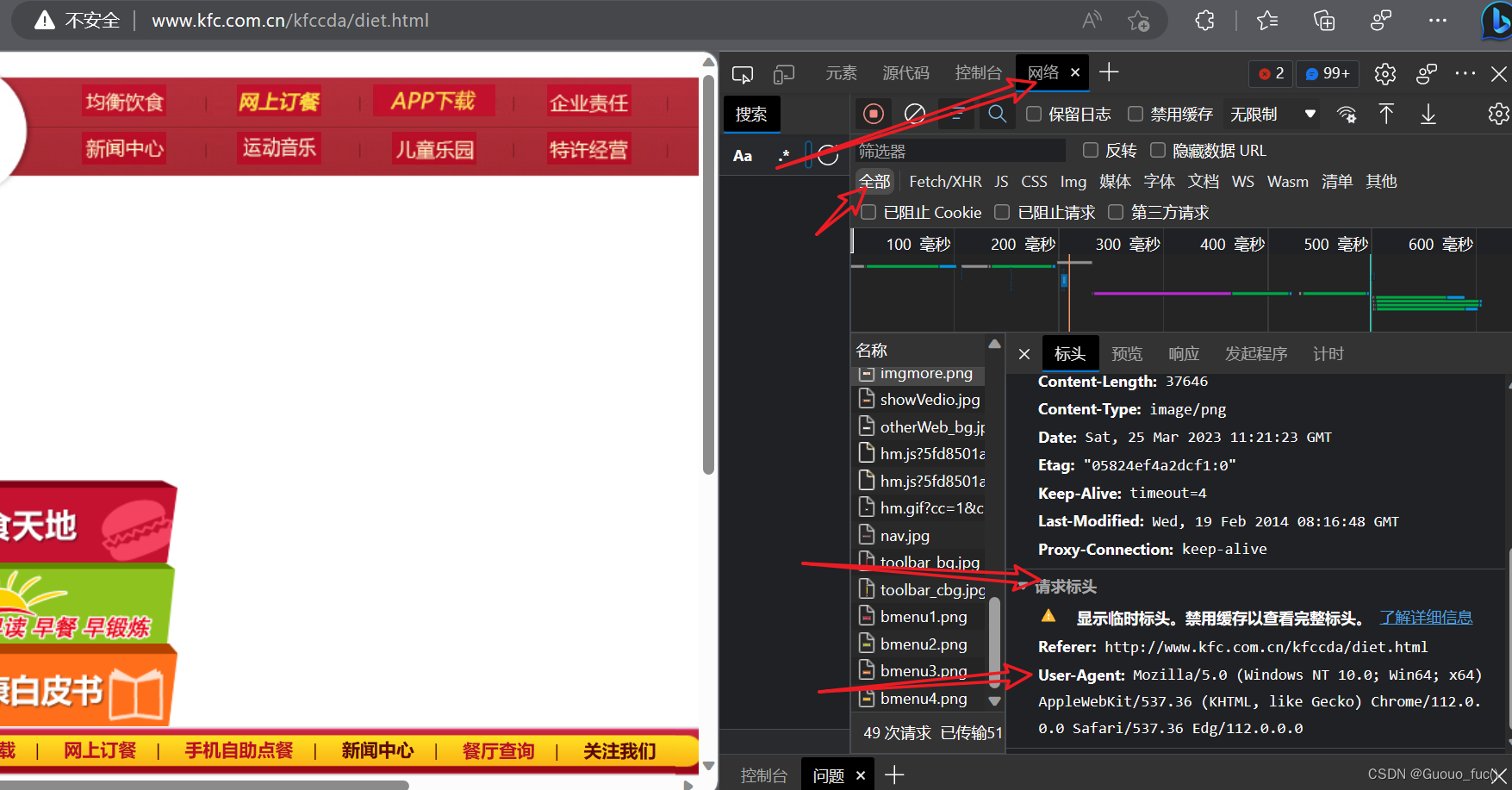 首先点进某个网站,右键打开"检查",随便点,乱发一个请求,具体小文件可以随便选择,进入到有请求标头的小文件中,即可查看自己的UA标识