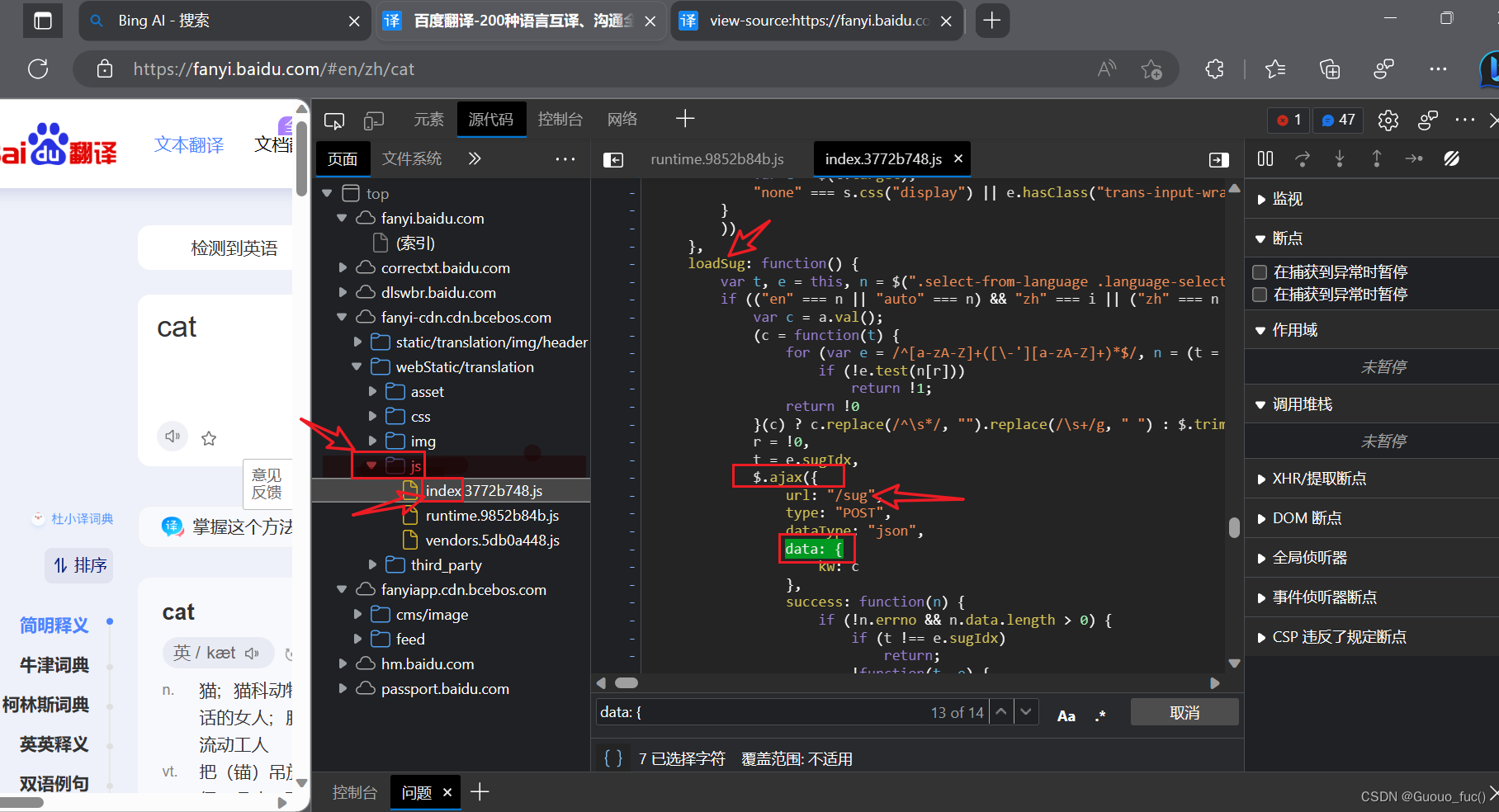 3.以上两者都无法找到则说明网站刻意隐藏参数名或着需要从其它的请求(如GET寻找信息),这里给出一种寻找data参数名的无奈之举,即前几种方式无果,但通过抓包发现post请求是通过一个sug后缀发出的,而已知该网站的前端框架为ajax框架,所以可以从源代码文件中的js文件索引中查询相关关键字,最终找到参数名为kw