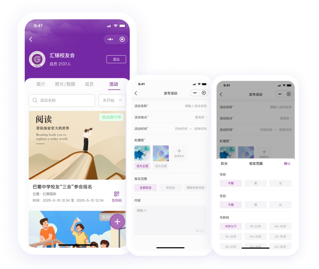 发布各类校友活动信息,提供在线报名、活动提醒、活动回顾等功能,提升活动组织效率与参与度,让校友不错过每一次相聚机会。