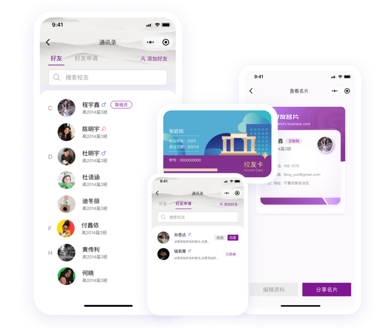 支持校友通过搜索或推荐添加好友并互相发送个人名片,可跳转到主流社交平台实现即时沟通,强化社交联结。