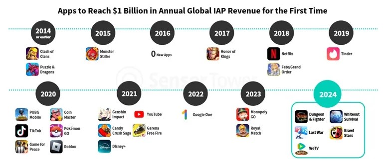 据Sensor Tower近期发布的报告,2024年全球有11款游戏的IAP(应用内购买)总收入突破了10亿美元,其中有四款游戏首次达到了这一里程碑。《Last War》、 《Whiteout Survival》、 《Dungeon & Fighter》和《Brawl Stars》是最新加入10亿美元俱乐部的游戏。