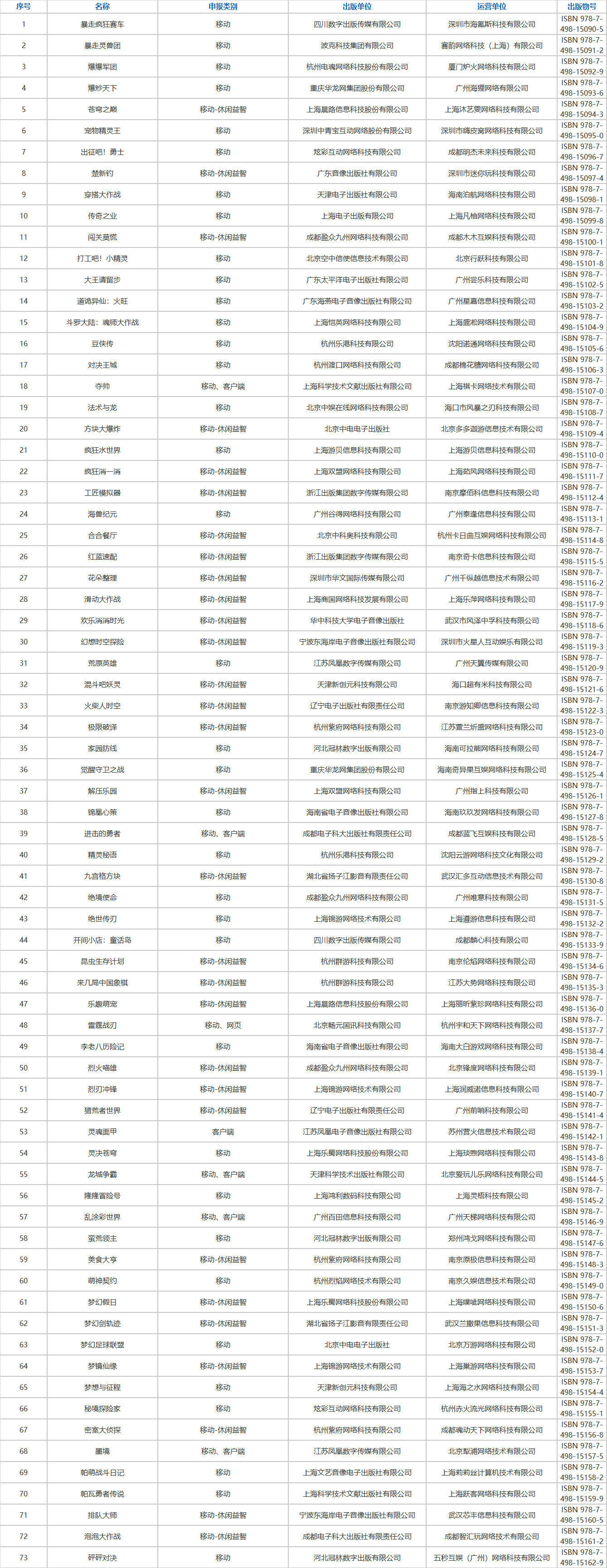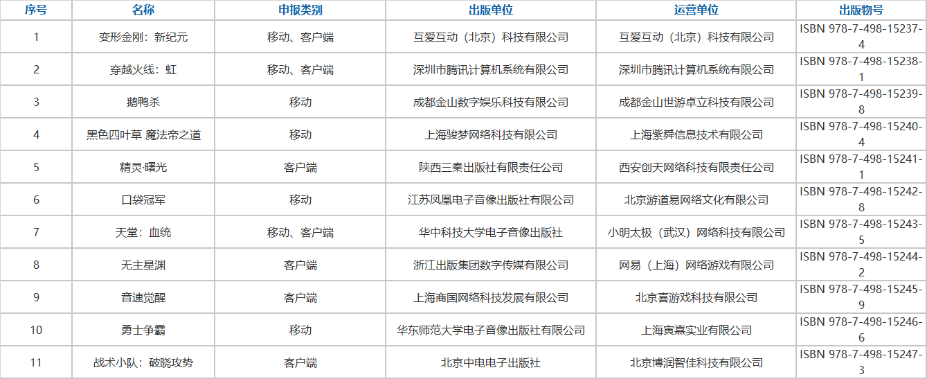 本次过审版号腾讯《穿越火线:虹》、网易《无主星渊》 、莉莉丝《帕萌战斗日记》、 4399《神都奇缘》、金山世游《鹅鸭杀》、恺英《斗罗大陆:魂师大作战》等知名厂商产品在列。