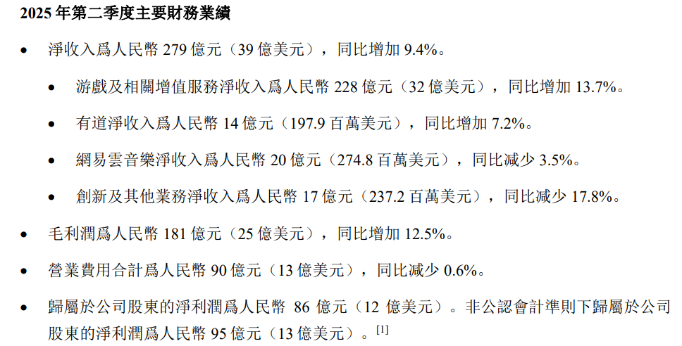 8月14日,网易公布了2025年第二季度的财务报告,报告中提到,公司期内净收入为人民币279亿元,同比增长9.4%;游戏及相关增值服务净收入为人民币228亿元,同比增长13.7%,其中在线游戏净收入占比为97.1%,约合人民币221.4亿元。在线游戏的同比增长主要来自于《第五人格》、《燕云十六声》和《漫威争锋》,以及若干代理游戏等净收入的增加。