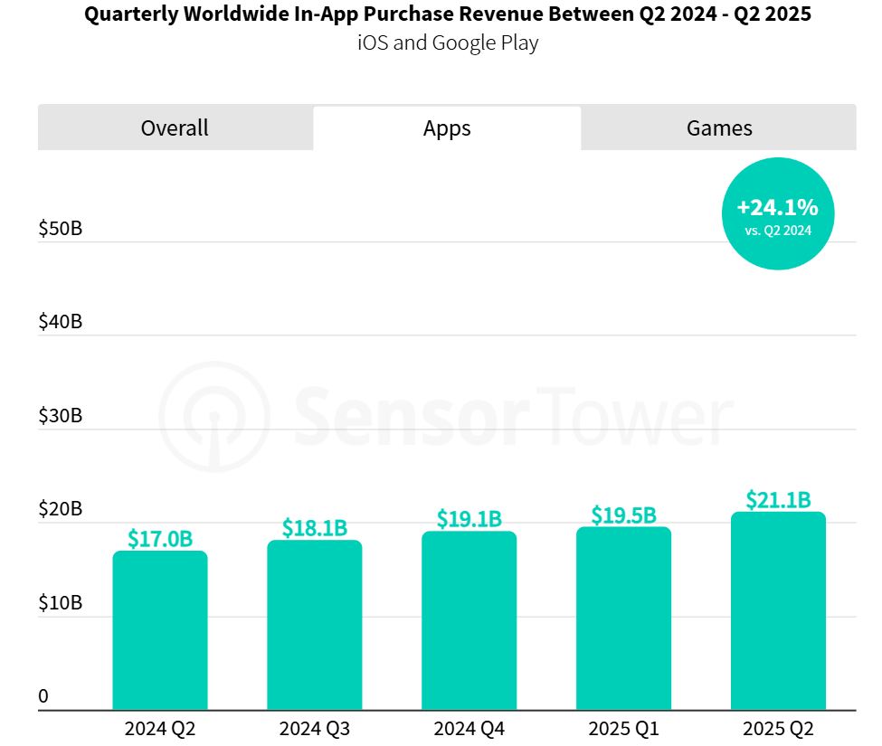 根据 Sensor Tower 最新发布的报告显示,2025 年第二季度,移动消费者在非游戏应用的应用内购买和订阅支出首次超过游戏。相比之下,手游市场整体保持稳定,第二季度手游 IAP 收入达 198 亿美元,同比微增 0.7%,环比则基本持平。