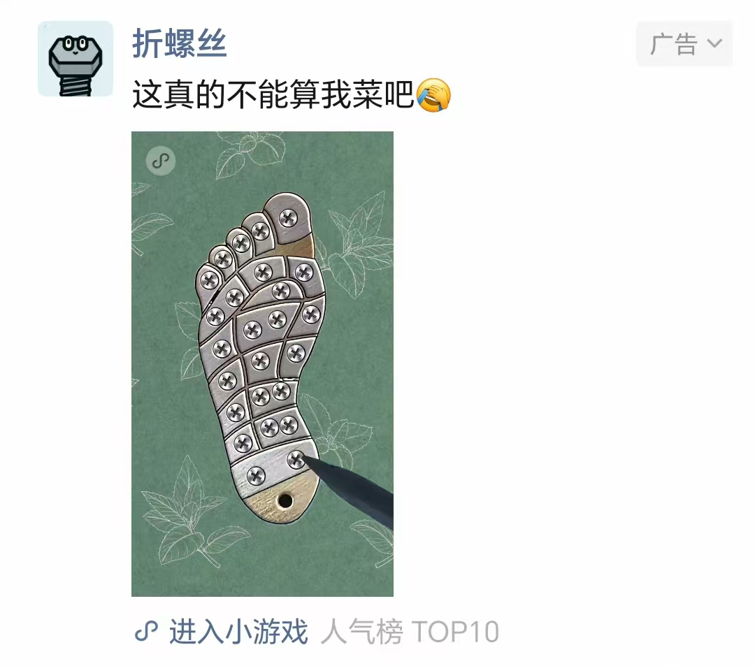 “别笑,你也过不了第二关”——这句广告语在微信朋友圈、抖音等信息流广告中频繁刷屏,并且迅速从一句口号演变为网络热梗。这正是螺丝益智游戏传播效力的集中体现。用户自发在各类图片的“脚底板”位置P上螺丝图案进行调侃和二次传播,持续推动游戏在社交媒体中的自发传播与用户增长。