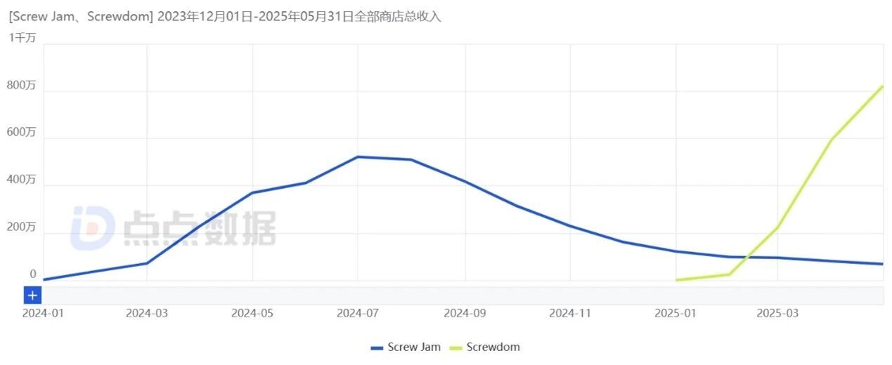 在这一3D化浪潮中,iKame Games于2025年1月推出的《Screwdom》表现尤为突出。根据点点数据,该游戏自2月起迅速攀升,截至5月累计流水已达822万美元(约合5889万元人民币)。这一成绩不仅突破了拧螺丝类产品的月流水纪录,超过了《Screw Jam》的历史峰值,甚至逐步逼近当前混合休闲游戏的头部产品——《Color Block Jam》所保持的千万美元级月流水水平。