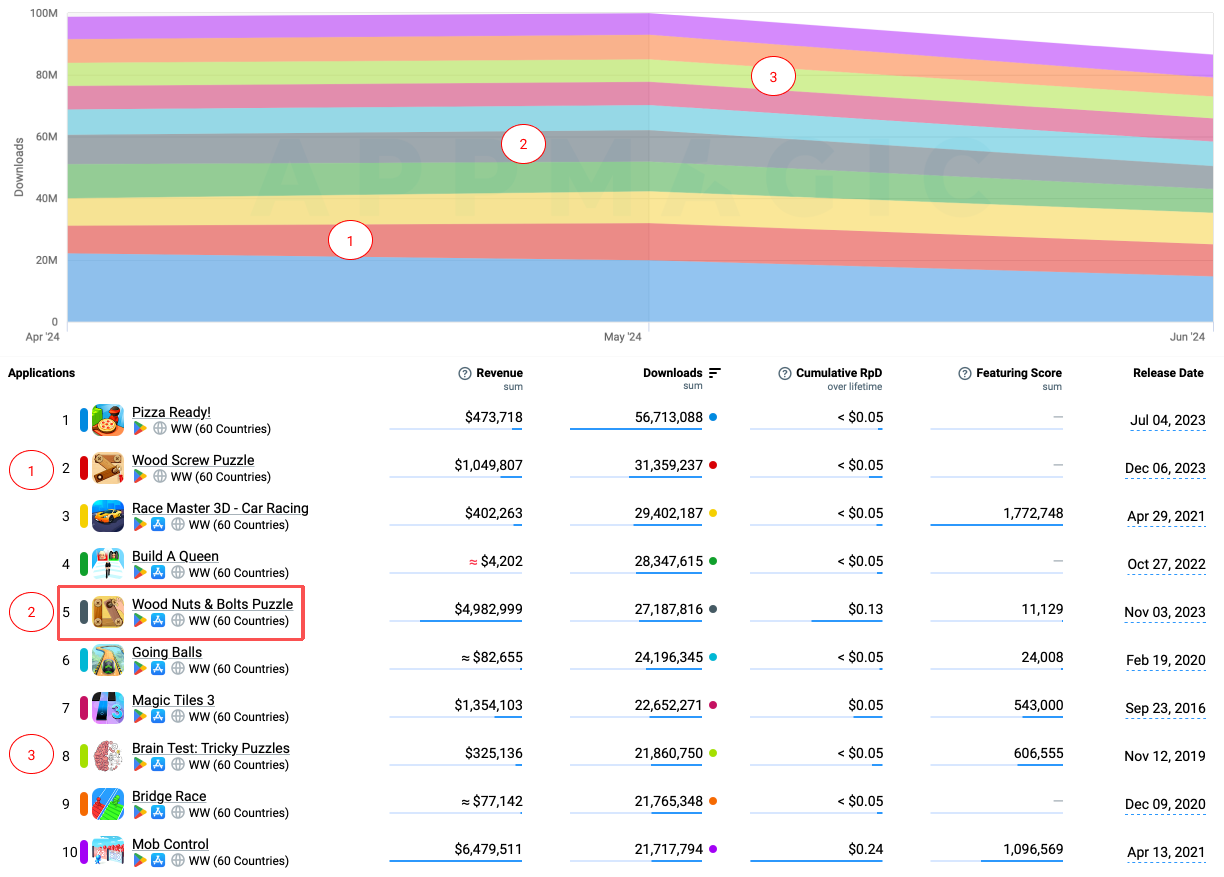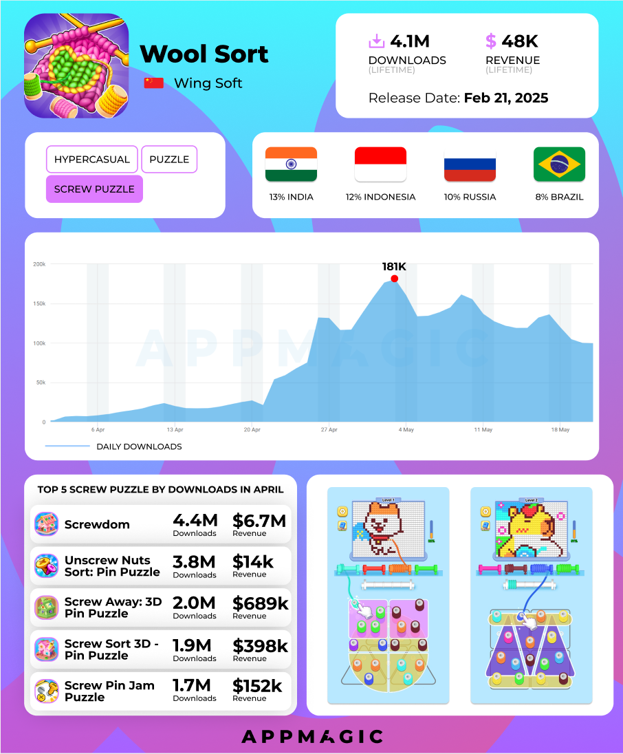 多机制的融合大大增强了游戏的可玩性,推动其在短期内迅速爆发:上线数月内即登顶热度风向标排行榜榜首,4月份下载量在螺丝益智品类中飙升超过50位。截至5月,其全球累计下载量已突破400万,展现出强大的混合玩法吸引力。