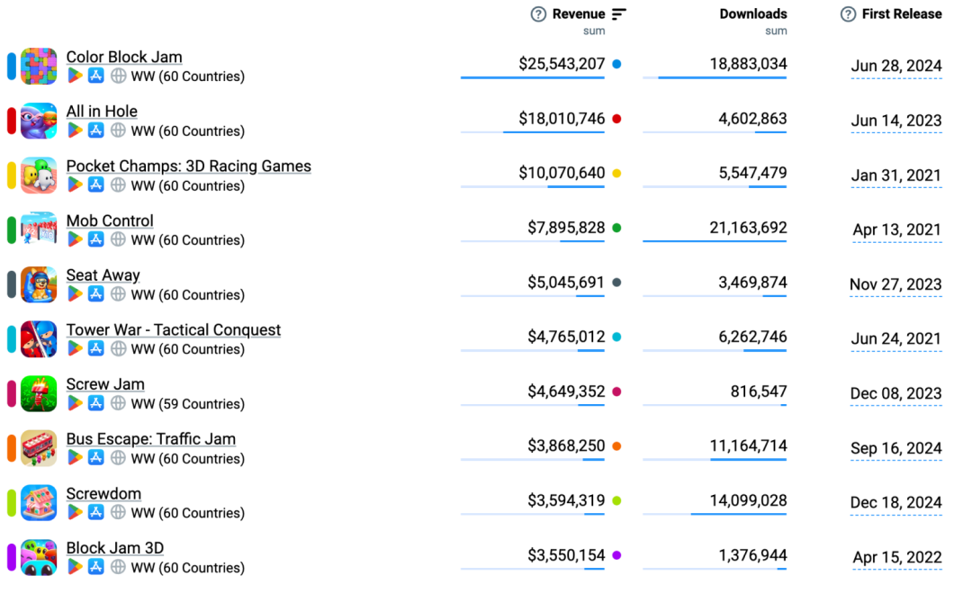 近年来,休闲益智品类持续突破创新,市场表现显著提。其中,块消益智、螺丝益智和排序益智已成为该品类的三大主力,不仅有像《Color Block Jam》这样首个月流水突破千万美元的混合休闲方块益智游戏,也有如《Screwdom》般上线仅半年便收入表现强劲的3D螺丝益智产品。