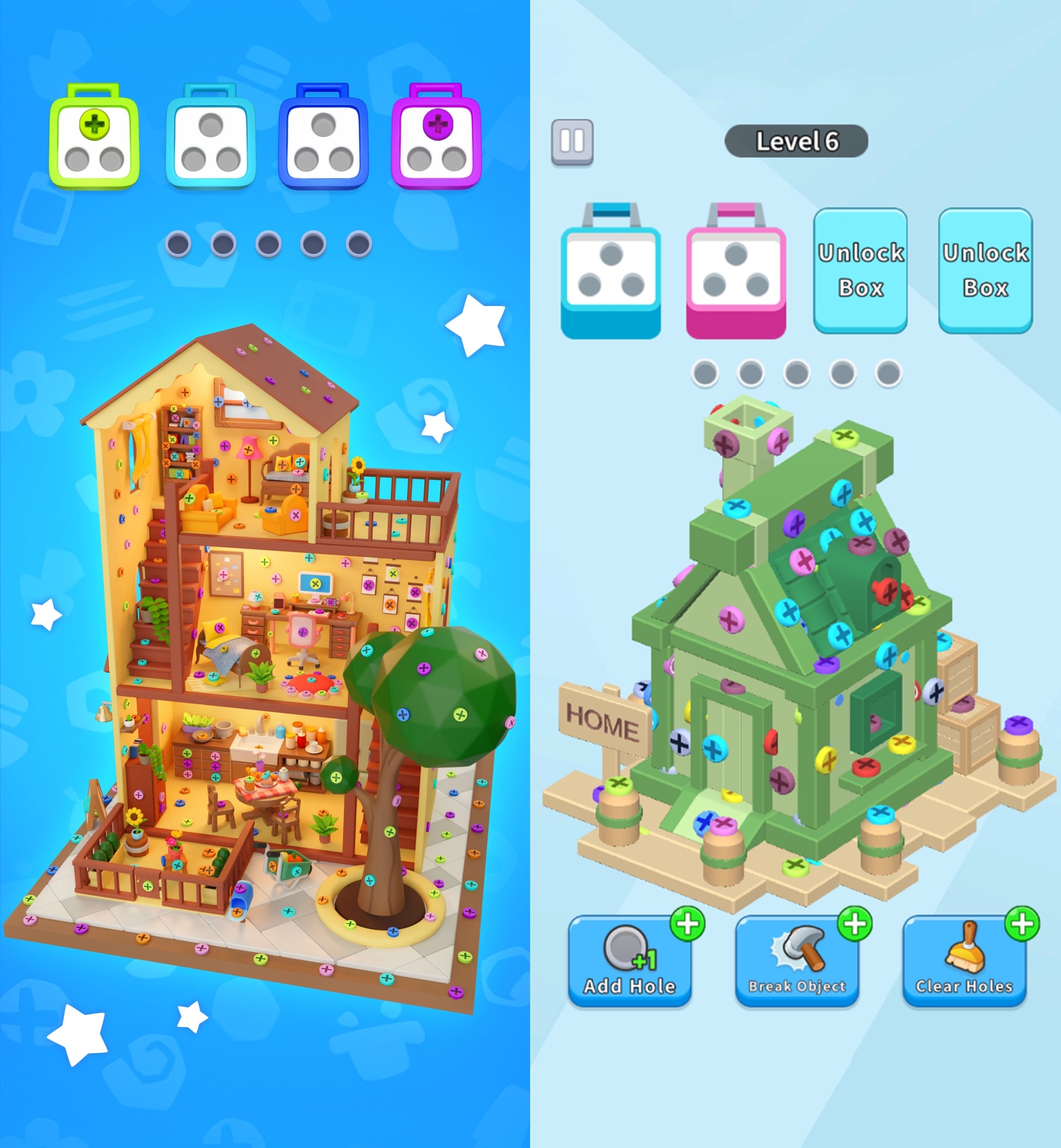 尽管《Wood Nuts & Bolts Puzzle》和《Screw Jam》的上线时间与核心玩法较为接近,但两者在具体设计和体验上存在明显差异。《Wood Nuts & Bolts Puzzle》采用木质纹理的螺丝与背板,整体画风偏向简约朴素。 玩家的目标是将木板上的螺丝放入空闲孔中,解开所有木板完成通关。而《Screw Jam》则呈现出更精致的视觉风格, 采用半透明玻璃质感的背板,游戏中没有多余的孔洞,玩家需要将螺丝放入相同颜色的盒子中收纳,直至全部螺丝拆除完成通关。此外,《Screw Jam》在基础拆卸玩法中融入了消除元素,同时引入了类似三消游戏中的辅助通关道具和螺丝点亮建筑的系统,旨在驱动玩家持续留存。
