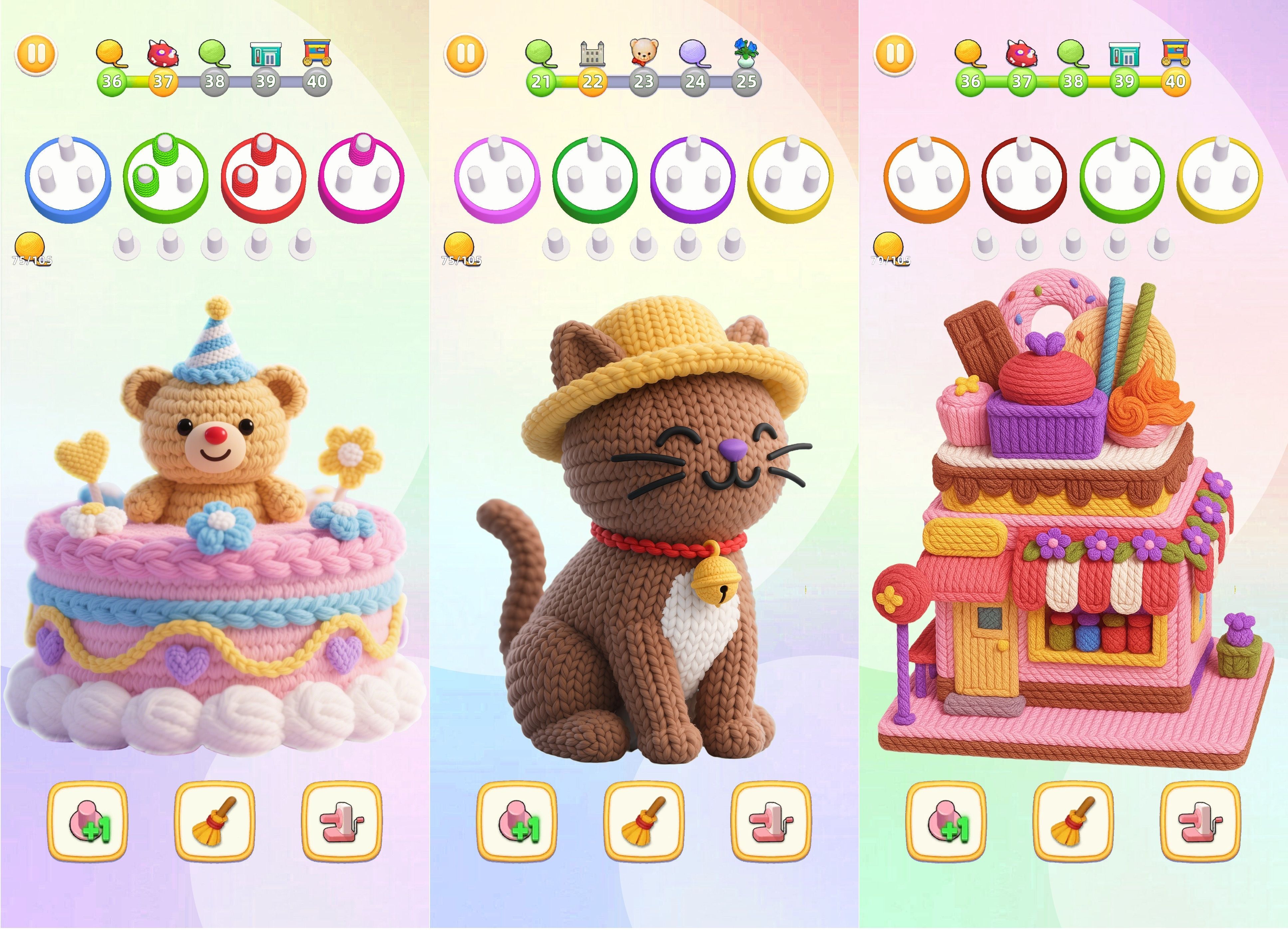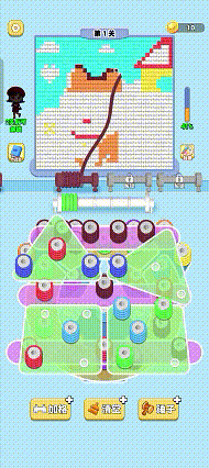 行业创新并未止步于单一的拆线玩法。2025年2月,多比特(Wing Soft)推出的《Wool Sort - Screw Jam Coloring》进一步拓展了该品类。该作融合了拧螺丝、拆毛线与十字绣元素,保留了经典半透明背板设计,但将螺丝替换为彩色毛线团。玩家需根据颜色柱提示,点击对应毛线将其缠绕至线轴上,每集满三组毛线即可自动完成十字绣的一个部分,最终拼合成完整图案方可通关。