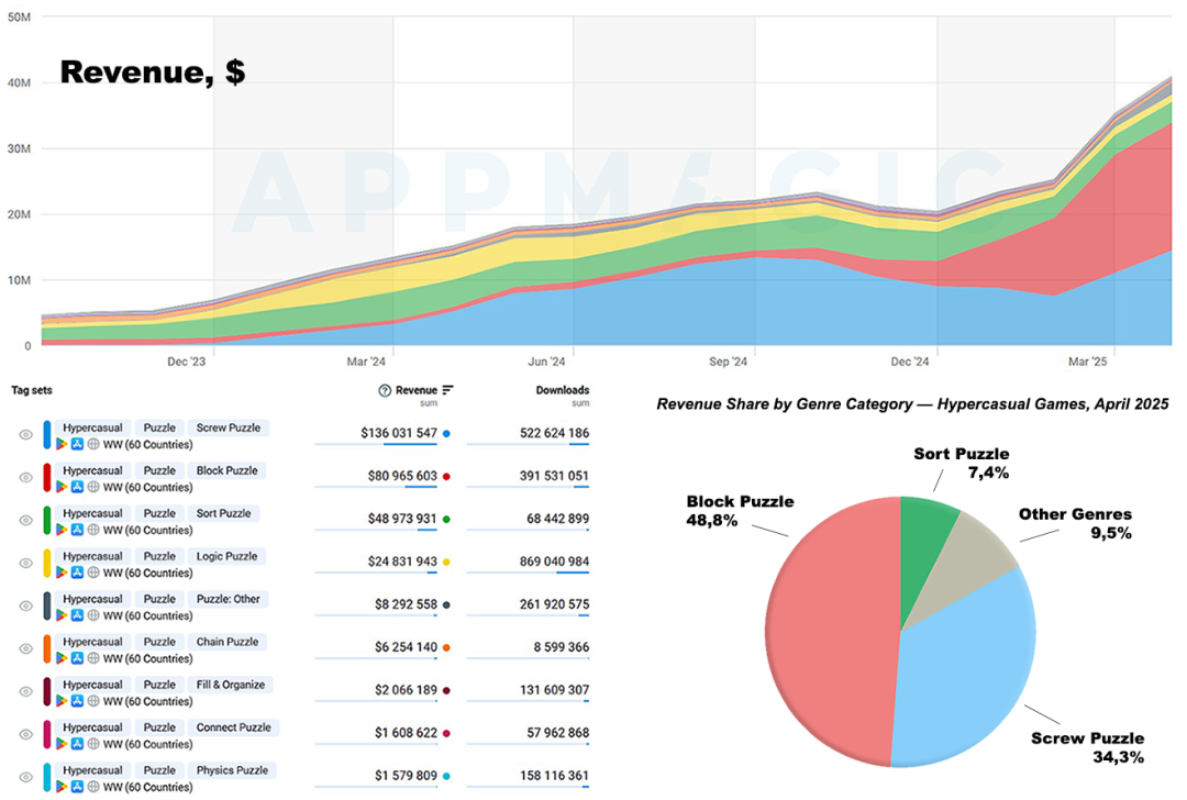 而截止2025年4月底,螺丝益智贡献了超休闲游戏内购总收入的34.3%,它正逐渐成为休闲益智中的头部细分品类之一。