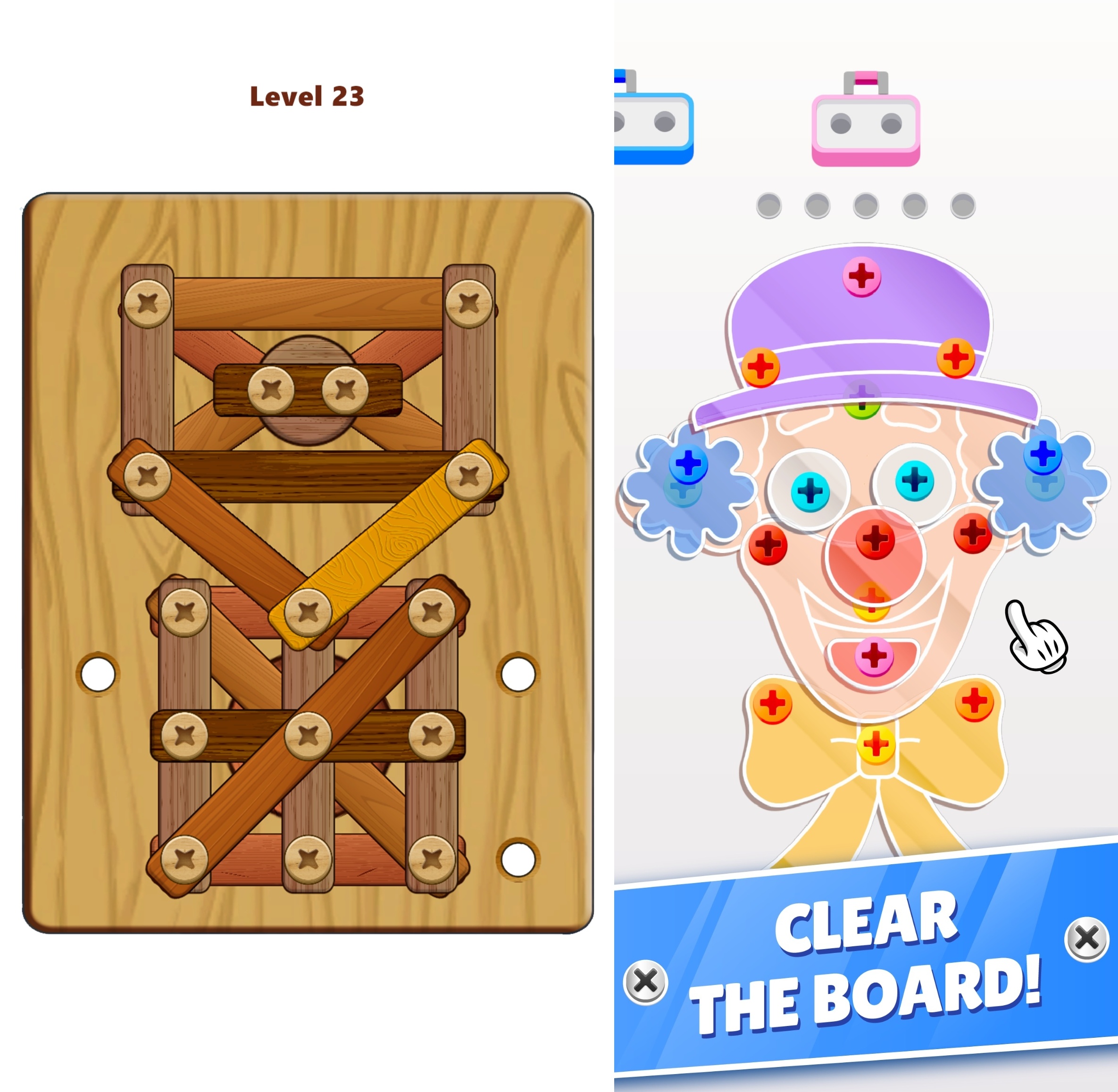 拧螺丝类游戏最初于2023年出现在市场中。2023年下半年,越南发行商ABI Games的《Wood Nuts & Bolts Puzzle》和土耳其休闲大厂Rollic Games的《Screw Jam》相继上线,成为这一赛道中最早脱颖而出两款产品。