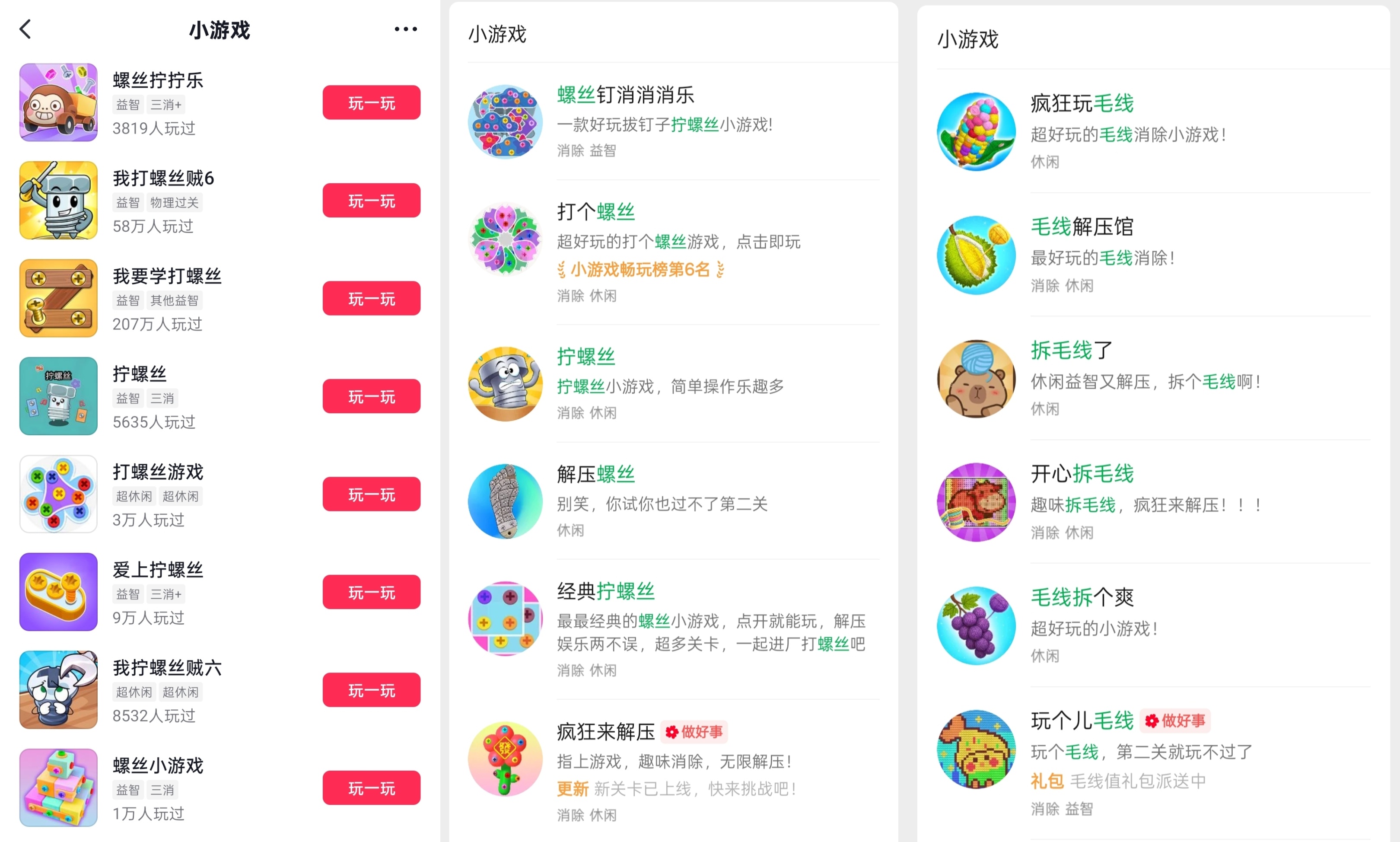拧下对应颜色的螺丝,拆开层层缠绕的毛线,直至将所有部件清除——这类操作简单却极具吸引力的“解压小游戏”,想必许多人在抖音或微信小游戏平台都曾畅玩过。