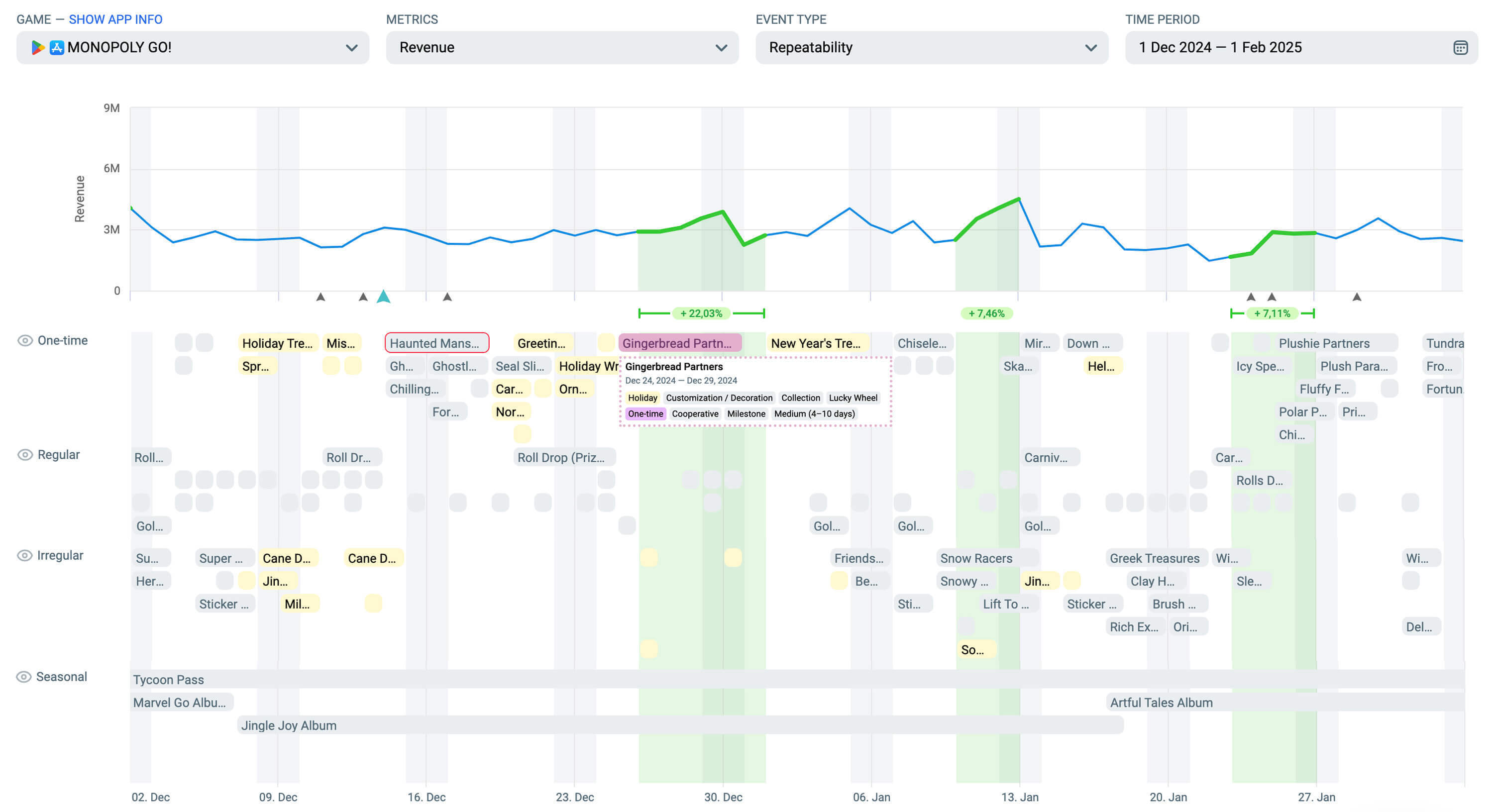 此外,冬季假期在许多方面都与赠送和向亲近的人表达感激有关。从这个角度看,合作活动可能会特别成功,因为在假期中花钱让他人高兴更具正当性且让人愉快!这又是Scopely将LiveOps转化为收入增长的一个例子,正如我们之前分析过的其竞争性活动和收入提升策略。