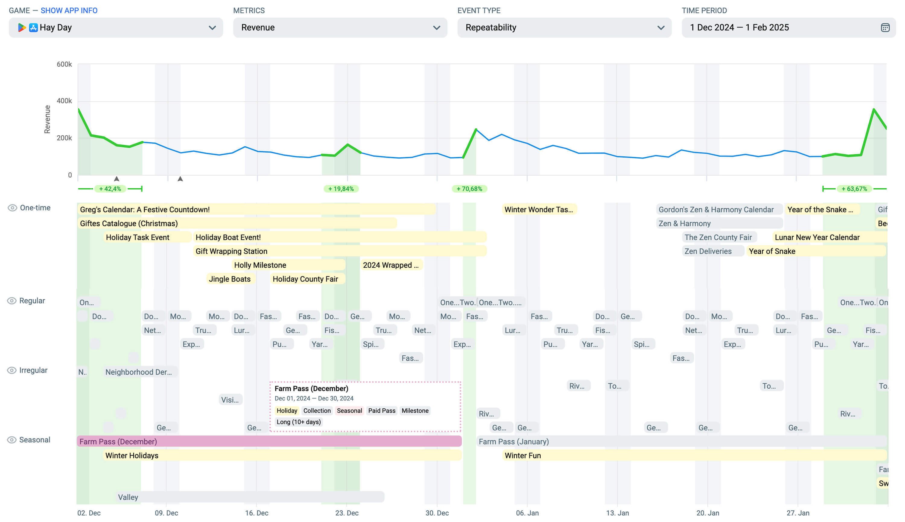 《Hay Day》的农场通行证(12月)证明了并不需要每次都进行节日重制才能保持玩家的参与度。它有着相同的里程碑进度、相同的每日任务和相同的舒适流畅体验,但这一切发生在一个不同的背景下。在12月,通行证与冬季假日内容同时上线,并有一整套节日附加内容:Greg's Calendar(格雷格日历)、礼物目录(圣诞)、礼物包装站、节日任务活动、节日船只活动、冬青里程碑等季节性活动。