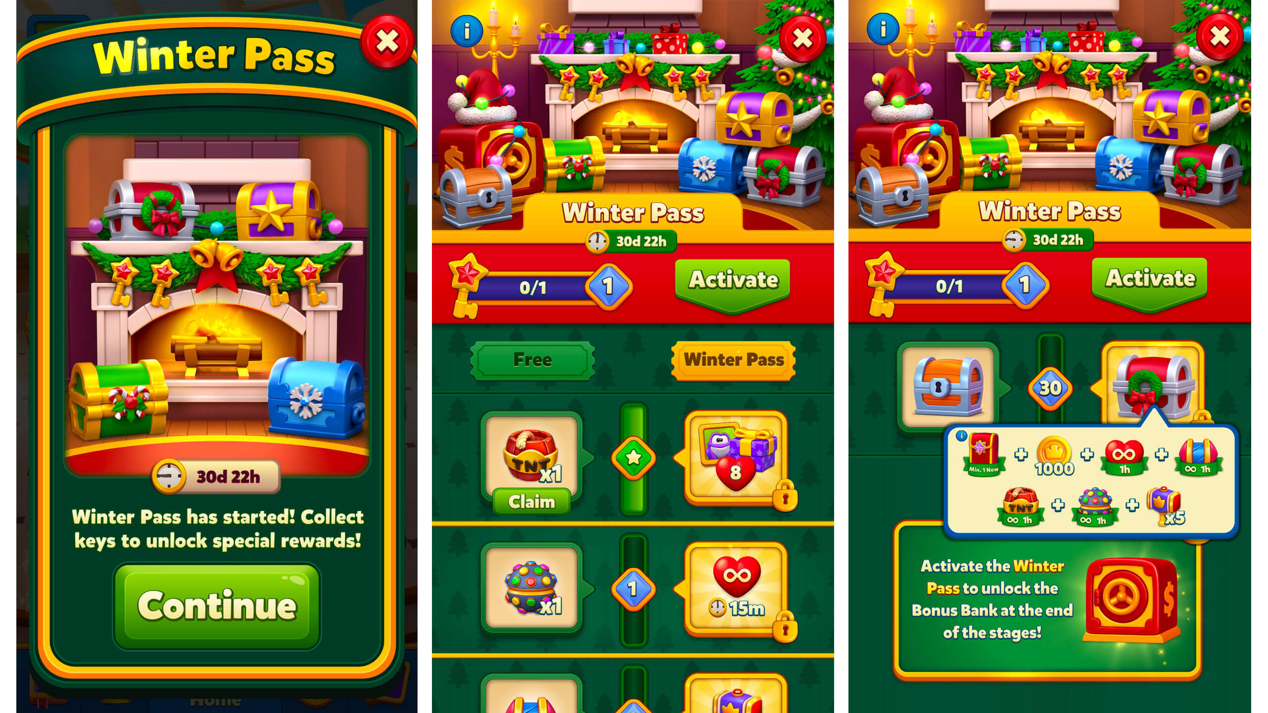 免费玩家在通行证过程中获得了加速器和金币,而付费玩家则收获了更丰厚的奖励:稀有的专辑卡片、节日装扮以及短时无限生命的加成。奖金银行(Bonus Bank)激励了最活跃的玩家,即使在完成通行证后,他们仍能继续领取奖励。