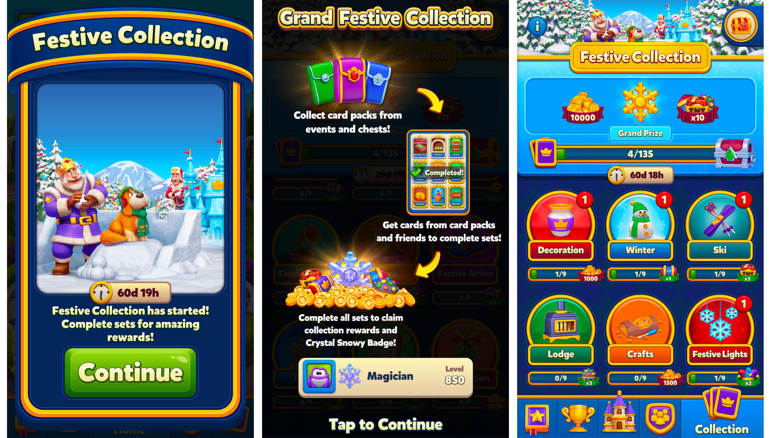 《Royal Match》的“Festive Collection”活动包含了15组每组9张卡片的主题套装。随机掉落、重复卡片和主题挑战设定了节奏。玩家通过常规玩法、豪华宝箱和冬季通行证(我们将在后文详细介绍)来收集卡片。交换功能允许玩家与朋友交换重复卡片,增加了一个轻度的社交循环,鼓励玩家每日登录。
