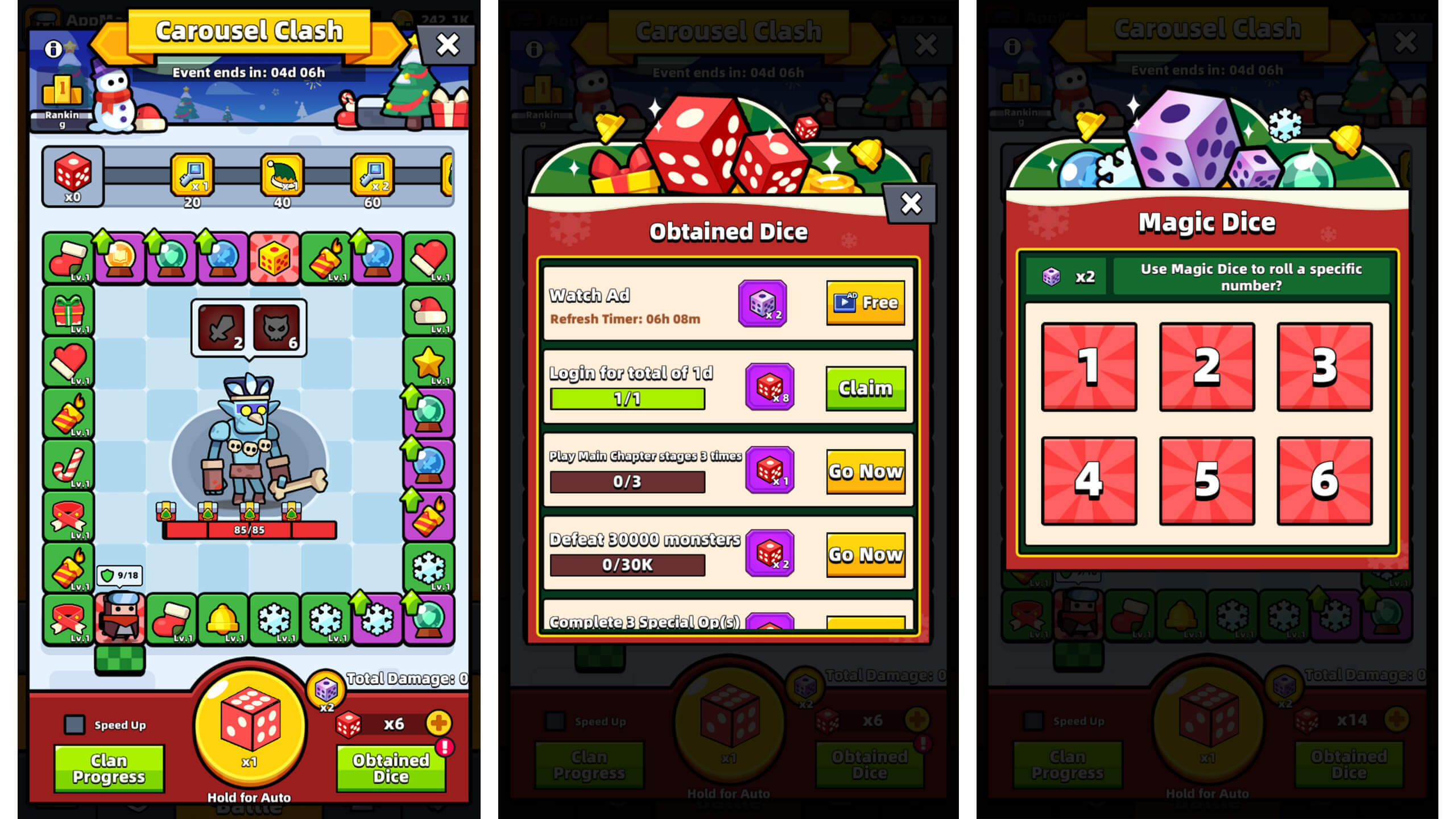 作为节日活动的一部分,Carousel Clash将合作理念与最忠实的玩家群体——公会玩家对接。参与者掷骰子与boss群怪进行战斗,触发随机效果,这些效果可能帮助玩家、伤害玩家,或搞笑地适得其反。