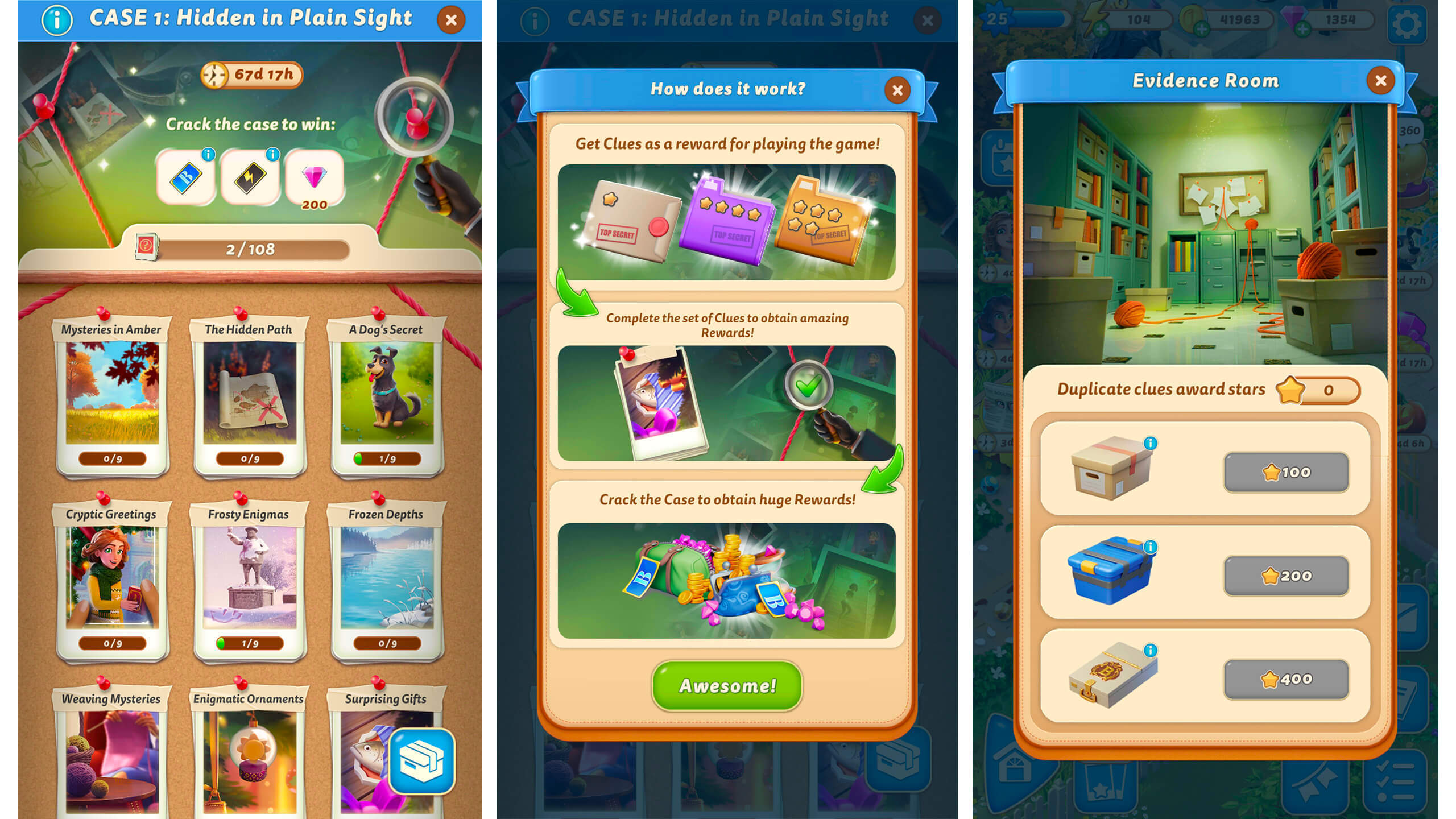 《Merge Mansion》以其独特的方式庆祝节日。它的冬季专辑“Hidden in Plain Sight”将圣诞和新年元素融入游戏的侦探剧情中。玩家收集的是12组9个“线索”(而非卡片),每组线索具有不同的稀有度,这些线索通过核心玩法中的合成棋盘获得。重复的线索可以在证据室交换为活动货币。在此过程中,节日神秘通行证提供了额外奖励和节日装扮,将个性化转化为持续的消费驱动力。