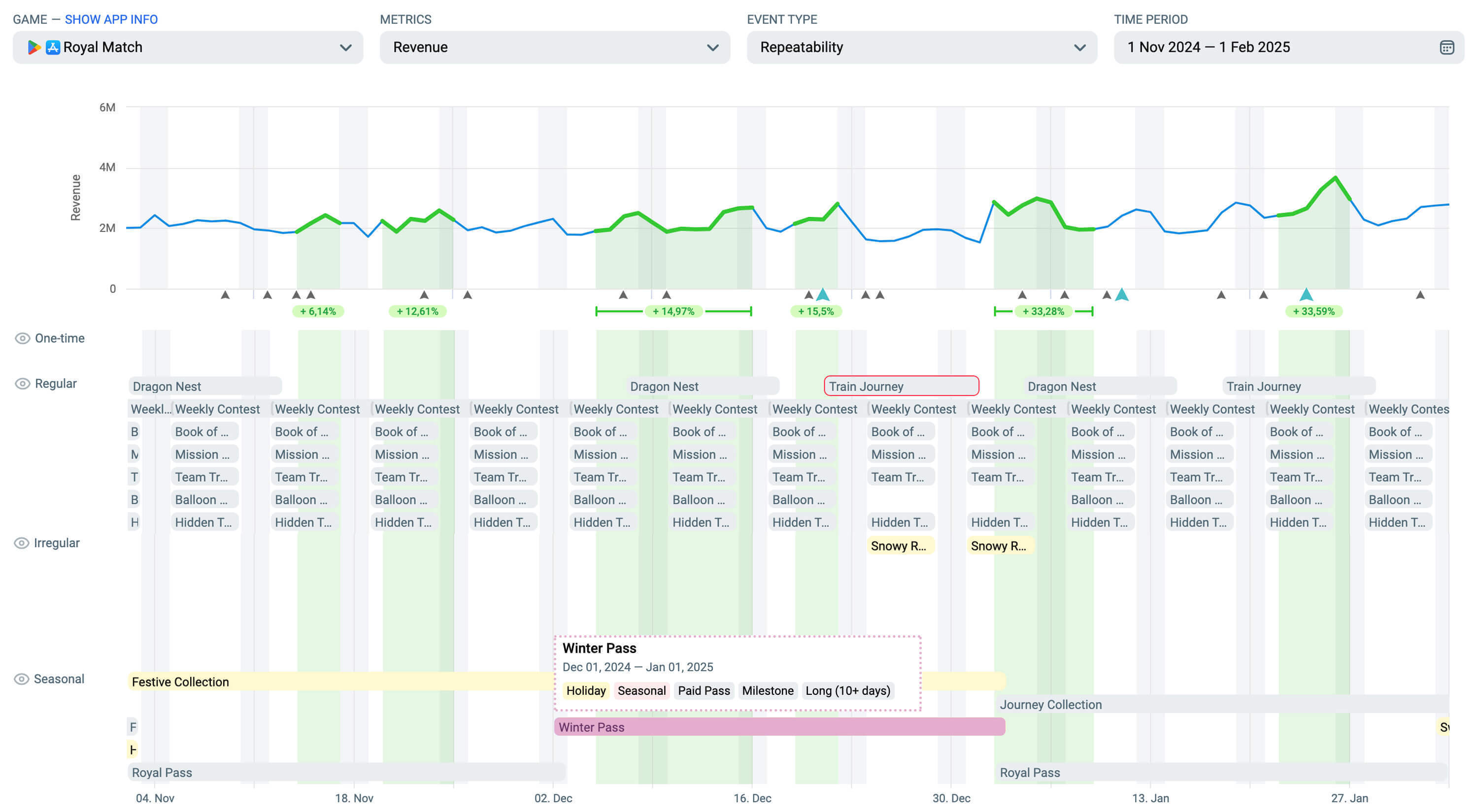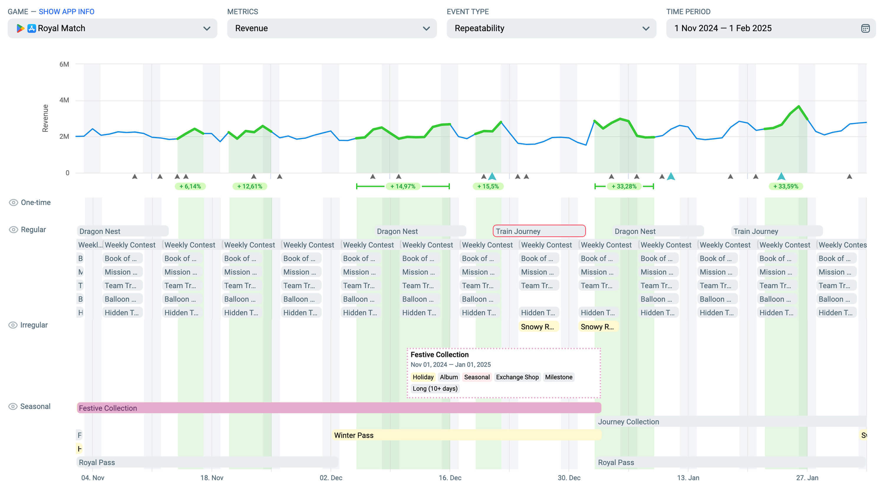 让它复杂:通过叠加多种活动类型,例如《Royal Match》的冬季通行证+Festive Collection,可以让每个系统相互支持,提升参与度和IAP收入。
