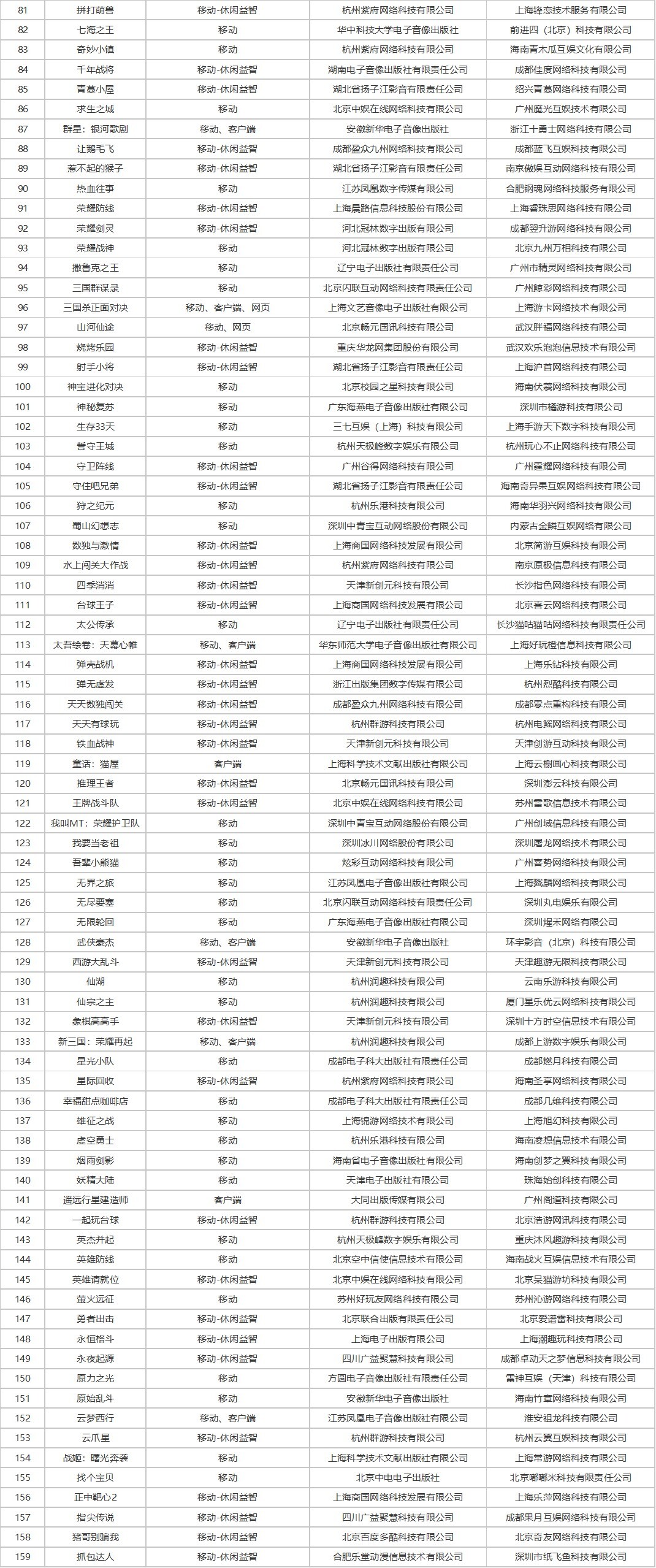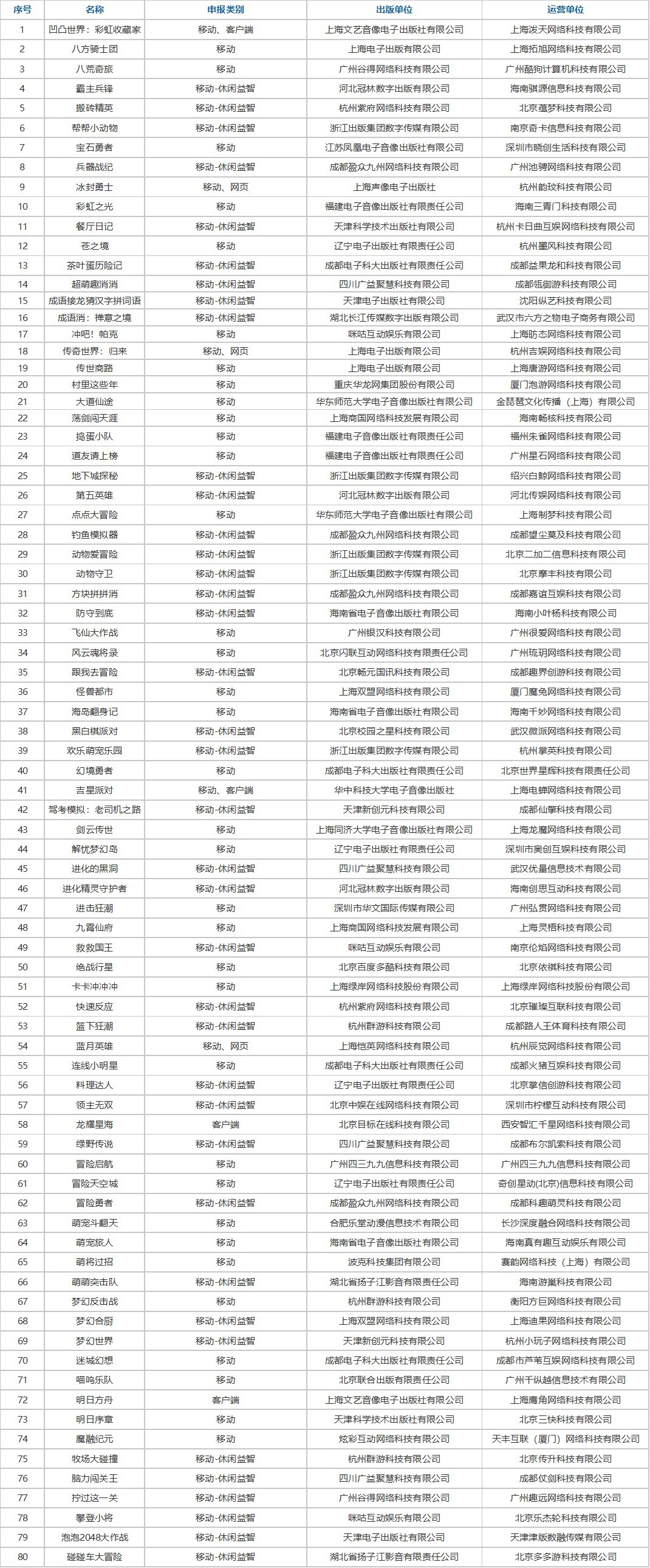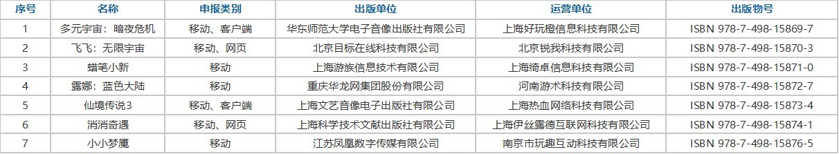 本次过审版号三七互娱《生存33天》、恺英网络《蓝月英雄》、冰川网络《我要当老祖》、4399《冒险启航》、蓝飞互娱《让鹅毛飞》、美团《明日序章》等知名厂商产品在列。
