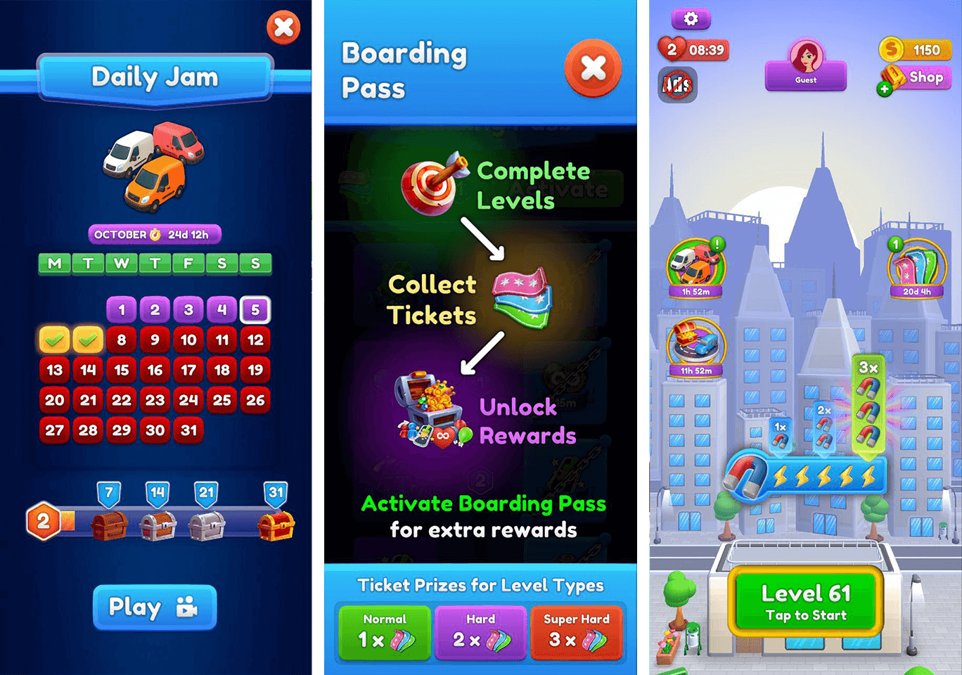 在第54级时,游戏引入了新的助推器——Magnet Power。它帮助通过在每个关卡开始时移除最多三辆车来加速进度,这取决于玩家当前的连胜数。这一机制增强了玩家保持连胜的动力,同时巧妙地鼓励购买助推器和重新尝试。随后,在第60级,玩家可以加入Sky Race活动,争夺共享的大奖,为游戏增添了一层轻度的社交元素。