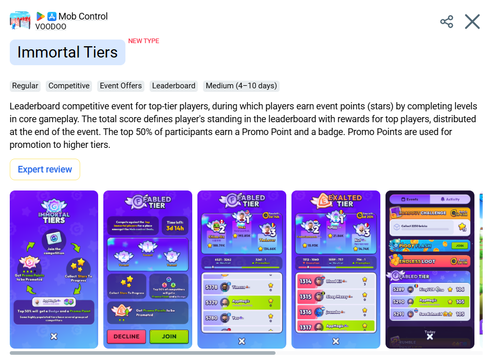 尽管它仍然是2021年发布的混合休闲老兵之一,但通过逐步进化的LiveOps,它保持了相关性。Immortal Tiers活动自6月推出以来,已经成为日历上的常驻活动。该活动专为顶级玩家设计,将排行榜排名与核心循环进度直接挂钩,为游戏增添了荣誉感和社交动力。