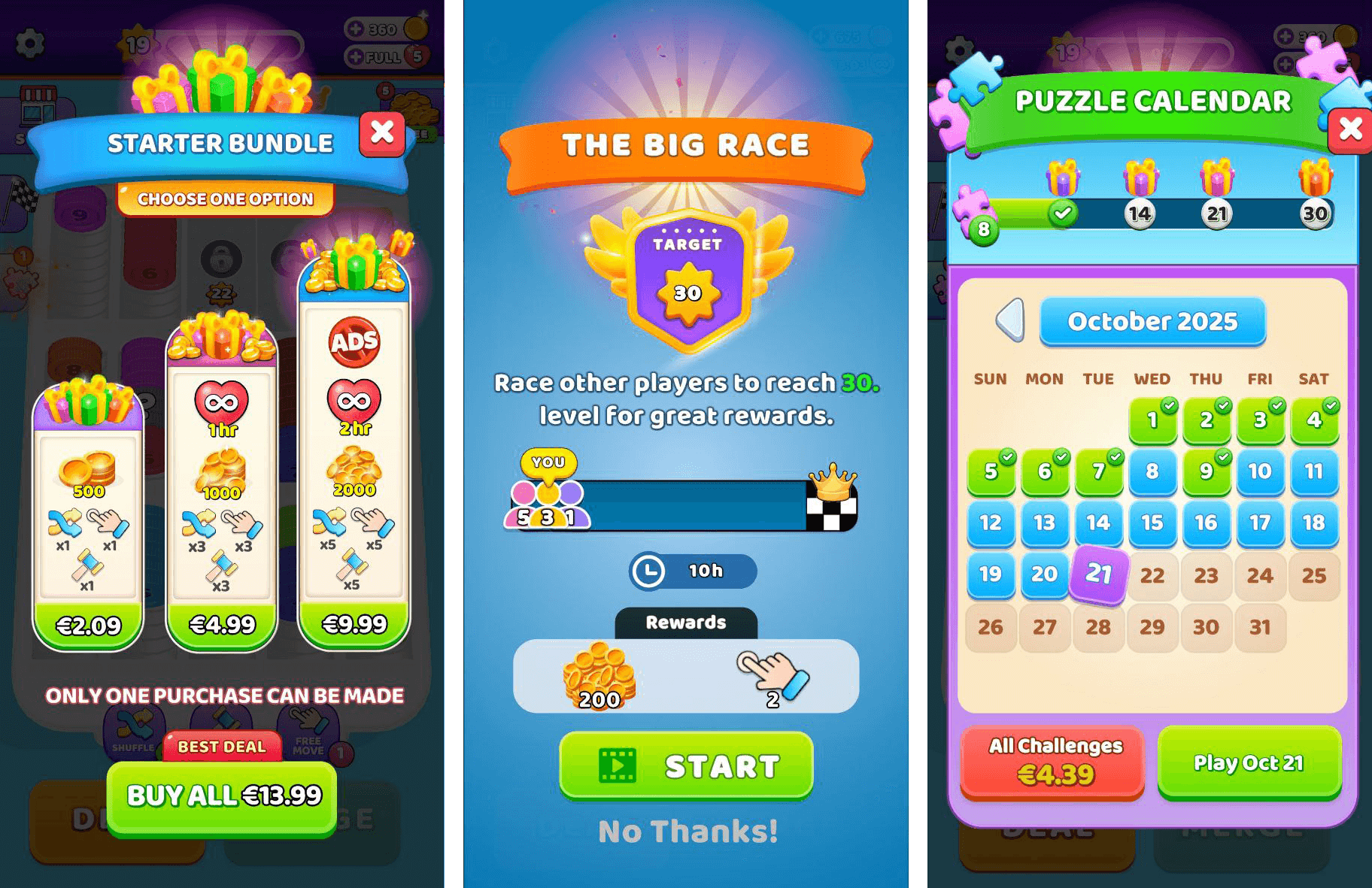 我们最近的LiveOps报告指出,竞赛格式已经成为混合休闲领域中最热门的趋势之一。在2025年上半年,超过60%的混合休闲游戏采用了这一机制,而《Coin Sort》迅速加入了这一趋势,展示了早期跟随市场信号能够带来的丰厚回报。