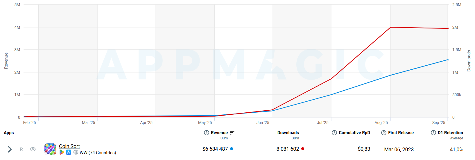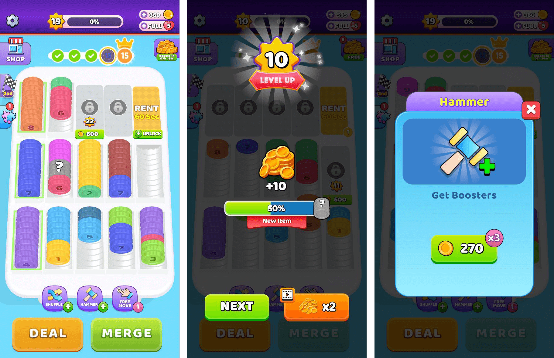 🎯 总结来说,《Coin Sort》给曾经流行的“水排序”益智带来了重生,加入了新的视觉效果、合并机制和一个无尽扩展的循环。该游戏的增长得益于平衡的盈利模式和轻度且持续的LiveOps。
