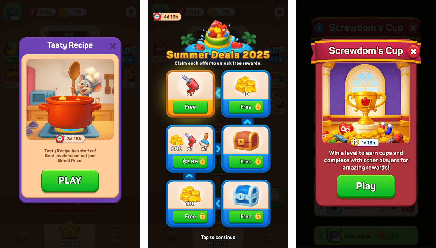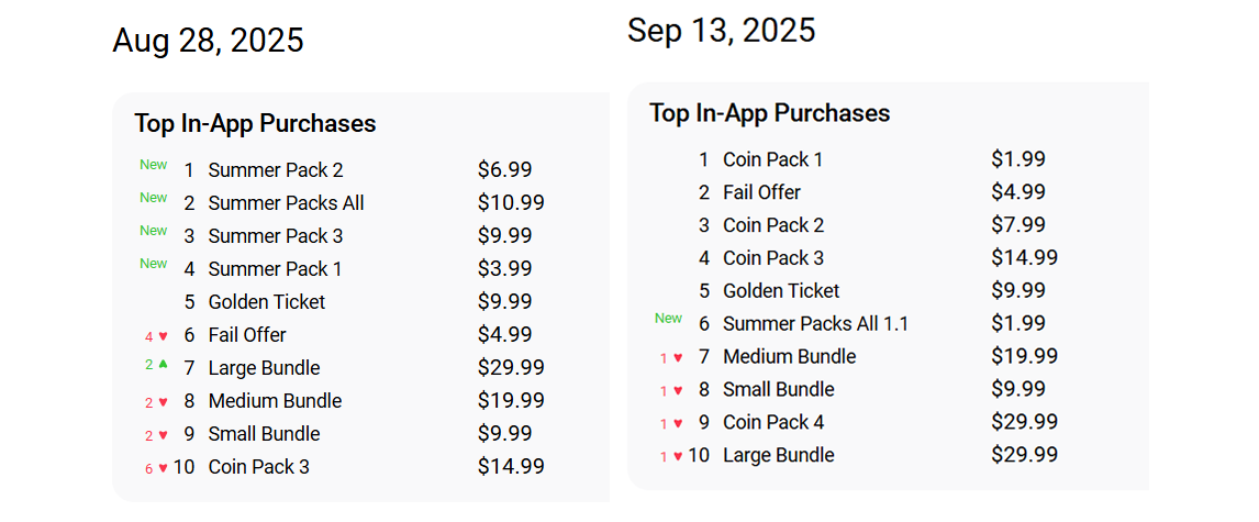 与此同时,《Screwdom》还推出了一个新的连锁优惠活动,旨在迎合夏季的需求,但它的主要收入来源保持稳定:$1.99的货币包和“Keep Up”优惠($4.99),该优惠在玩家失败后提供。两者加起来仍占总内购收入的30%以上,但《Screwdom》持续在发展中,展示了通过小而巧妙的调整来实现增长的最佳方式。