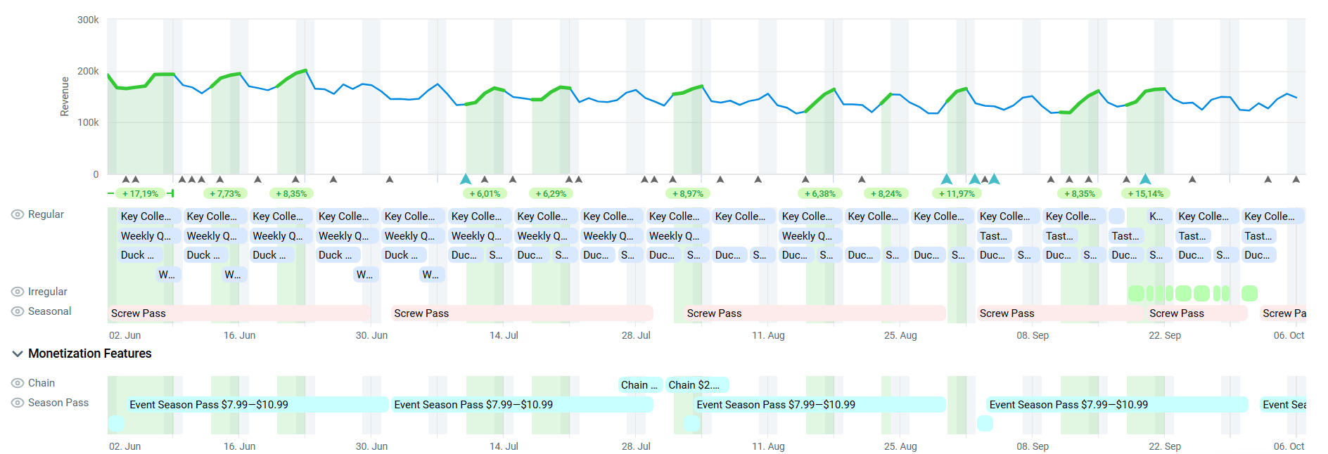 接着在9月,《Screwdom》推出了两项竞技活动:Screwdom's Cup和Basketball League。这两个活动都设有排行榜,排名与主要核心进程相关联。加上持续的常规活动,这两项挑战促成了本季度最大的收入激增,增长幅度接近15%。