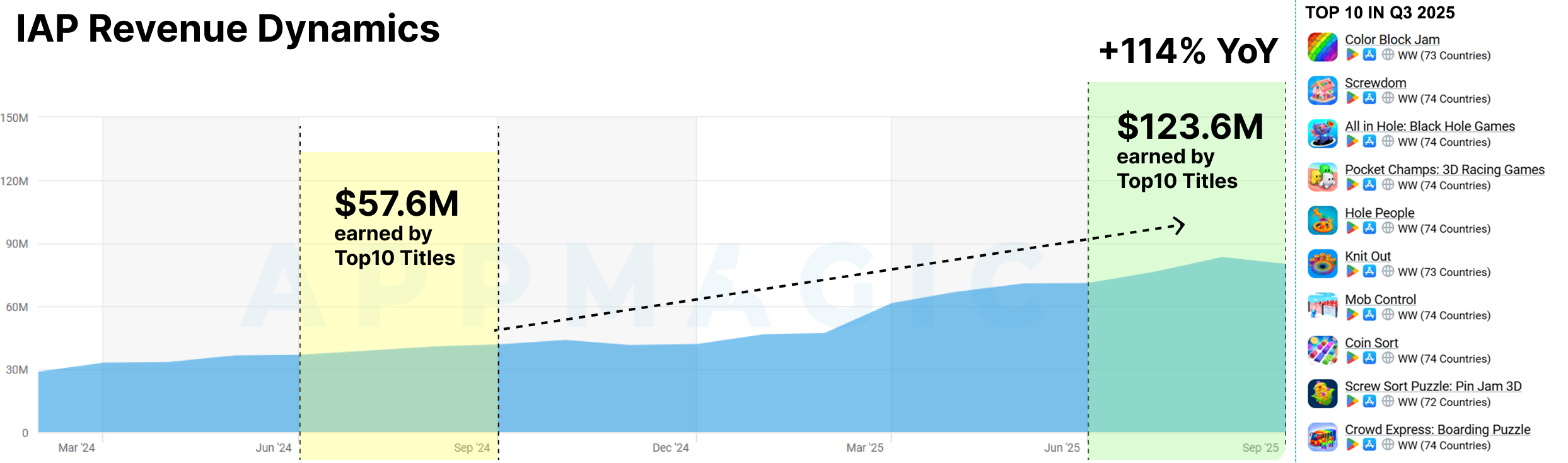 在我们对第二季度的回顾中,我们提到混合休闲游戏的收入相比2024年第二季度翻了一番,而现在这一势头正愈加强劲,第三季度同比增长了114%。然而,值得注意的是,大部分增长依然来自于一些熟悉的名字。市场的顶级游戏保持着极为稳定的增长,且本季度的新晋游戏数量比上季度还要少。