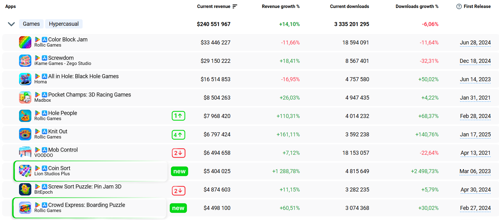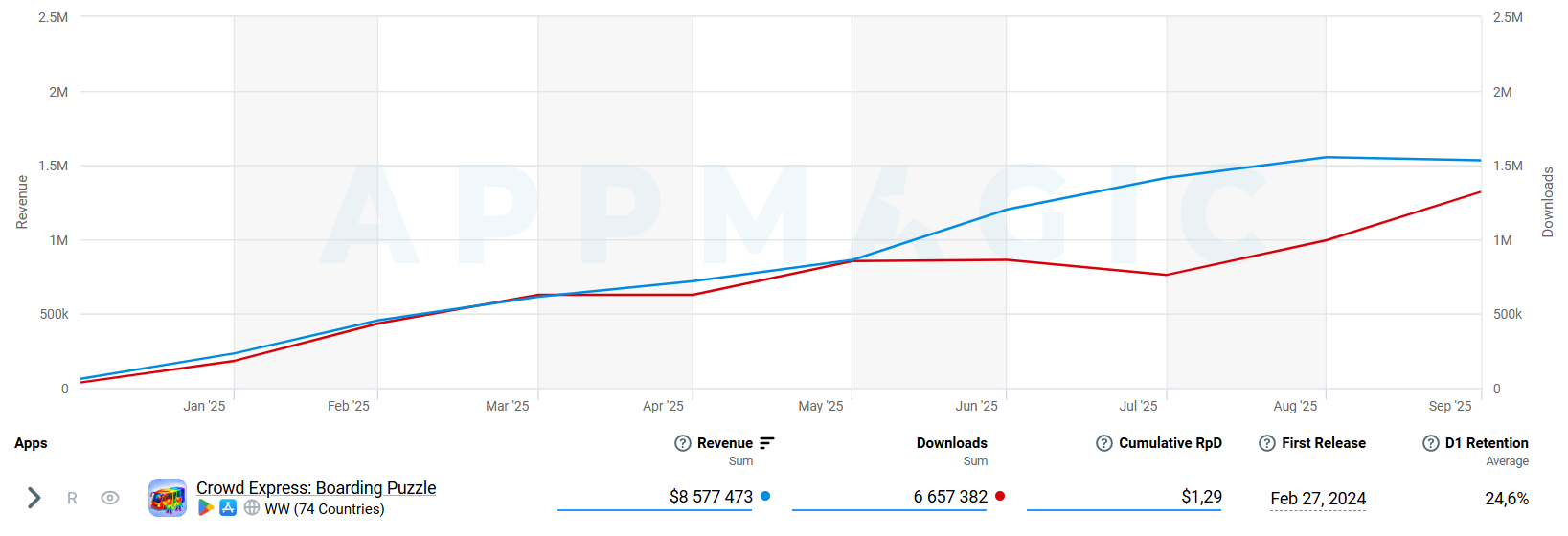 Rollic继续巩固其在混合休闲市场的地位,在2025年第三季度已经占据了四个Top 10席位。其最新的热门游戏《Crowd Express: Boarding Puzzle》于2024年12月全球上线,并展示了月复一月的稳定收入增长,最终成功进入排行榜前列。