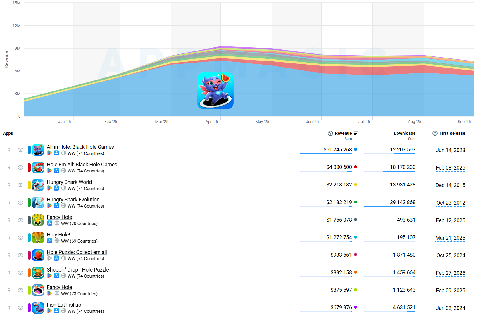 其中一款继承者——《Hole Em All》 于2025年2月发布,迅速突破了500万美元的终生收入,并获得了1860万的安装量,下载量超越了原版。但在收入方面,Homa的《All in Hole》依旧遥遥领先,得益于其强大的以内购为主的盈利模式,并且在7月加入了新的宝藏通行证(Treasure Pass),进一步推动了收入增长。《All in Hole》短期内还不会放弃它的霸主地位。