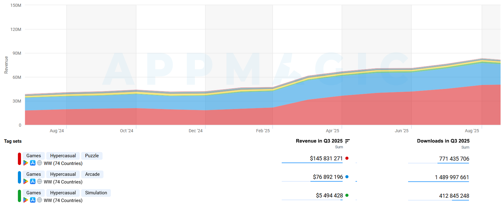 尽管整体趋势看似稳定,细节却展现了不同的故事。放大来看收入分布,我们可以看到,益智类游戏在2025年第二季度占据了超过一半的混合休闲收入,而到现在,它们的份额已扩展到60%以上。街机类游戏仍稳居第二位,尽管份额略有下降,从35%降至32%。
