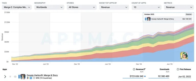 据AppMagic数据,柠檬微趣旗下《Gossip Harbor》在10月创造了约6200万美元的月度内购收入,成为二合类游戏迄今为止收入最高的游戏。自2022年6月推出以来,该游戏已累计获得超过7.23亿美元的内购收入,并达到了9240万次下载。