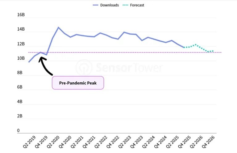 Sensor Tower预测,2026年iOS和Android平台的移动游戏市场下载量将回落至疫情前的水平。Sensor Tower最新报告显示,2025年前三季度的移动游戏下载量为369.4亿次,预计全年将增长至488.5亿次。然而,2026年这一数字预计将同比下降4.6%,降至466.2亿次,其中第三季度的下载量可能降至112.9亿次,为季度最低值。