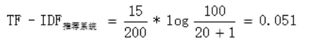 比如现在有一个预料库,包含了100篇(N)论文,其中涉及包含推荐系统(t)这个词条的有20篇,在第一篇论文(D1)中总共有200个技术词汇,其中推荐系统出现了15次,则词条推荐系统的在第一篇论文(D1)中的TF-IDF值为: