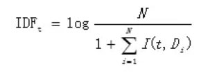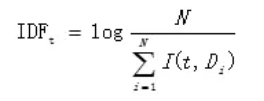 其中IDF(InverseDocument Frequency)表示总文档与包含词条t的文档的比值求对数,IDF的计算公式如下所示: