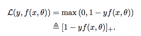 Hinge损失函数(Hinge Loss Function),对于二分类问题,假设y和f(x,theta)的取值分别为{-1,+1},Hinge损失函数为: