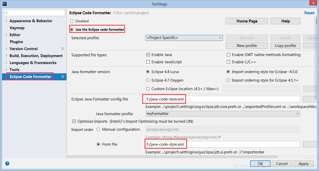 选择Setting ->Eclipse Code Formatter,勾选Use the Eclipse-code-formatter,并在Eclipse Java Formatter config file选择Eclipse用的java-code-style.xml文件,这个选项会决定格式化代码的方式。同时配置Import order的From File也为Eclipse用的java-code-style.xml文件,这个选项会决定组织import区域的方式。如下图: