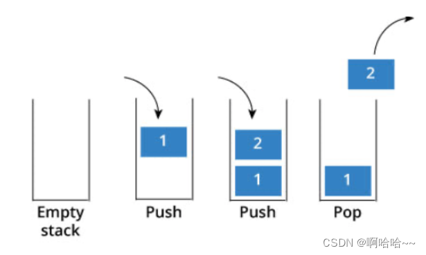 栈:存放入栈的数据会被放入栈底,之后存入的数据会被不断地堆叠在先前存入的数据之上,这个过程叫做压栈;而当我们需要取出数据的时候会依次从栈顶取出数据,这个过程叫做弹出,所以栈的特点就是先进后出,后进先出。